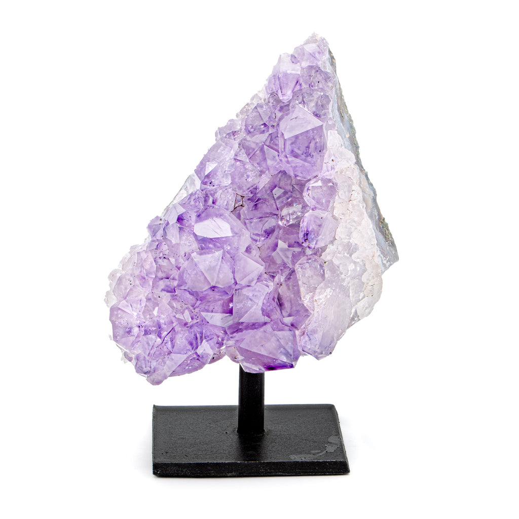 Each amethyst cluster comes mounted on a classic black metal stand with a sturdy base. Each cluster is a completely unique arrangement of crystals from a different geode. All are beautifully unique and show outstanding purple coloration.