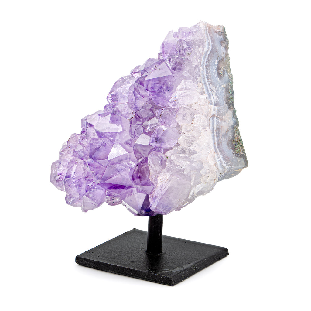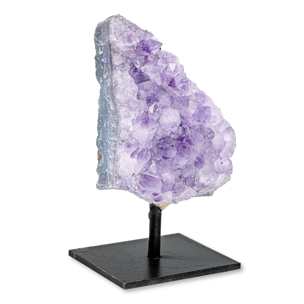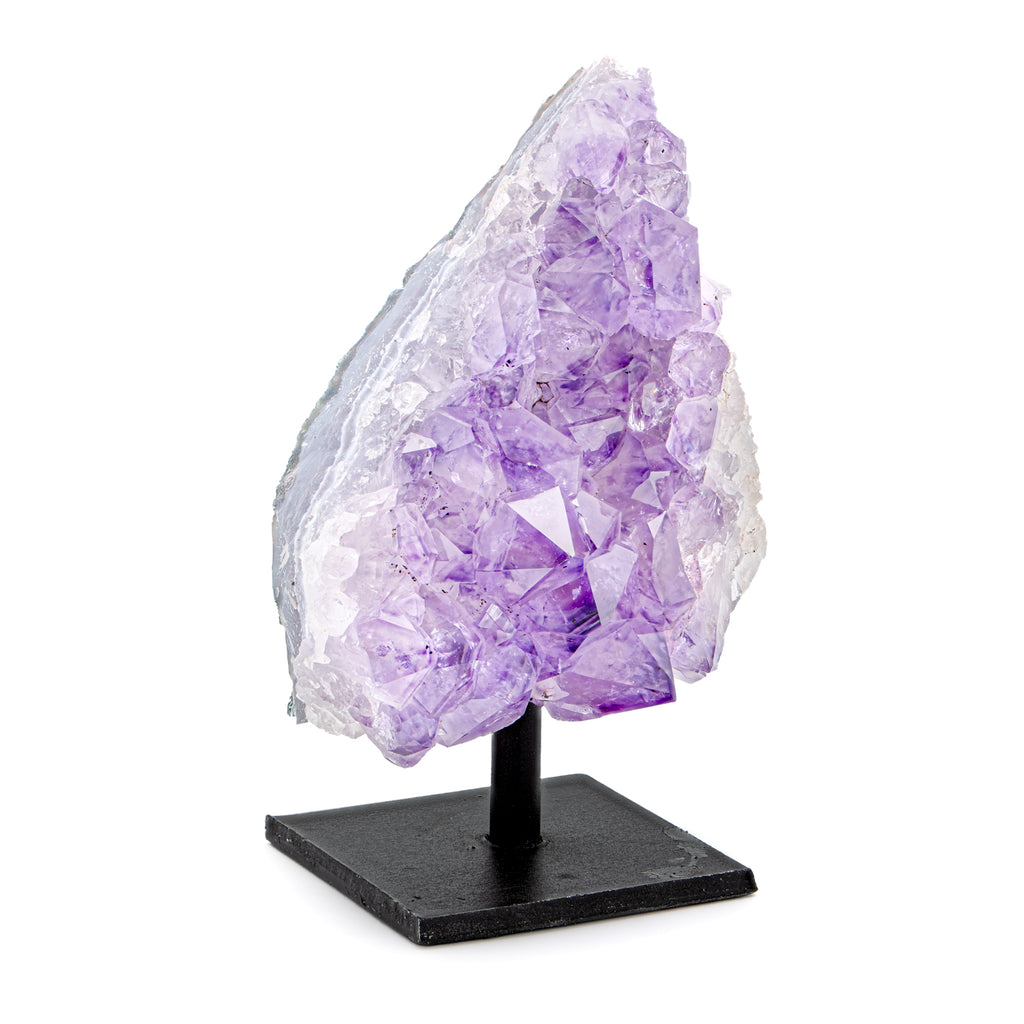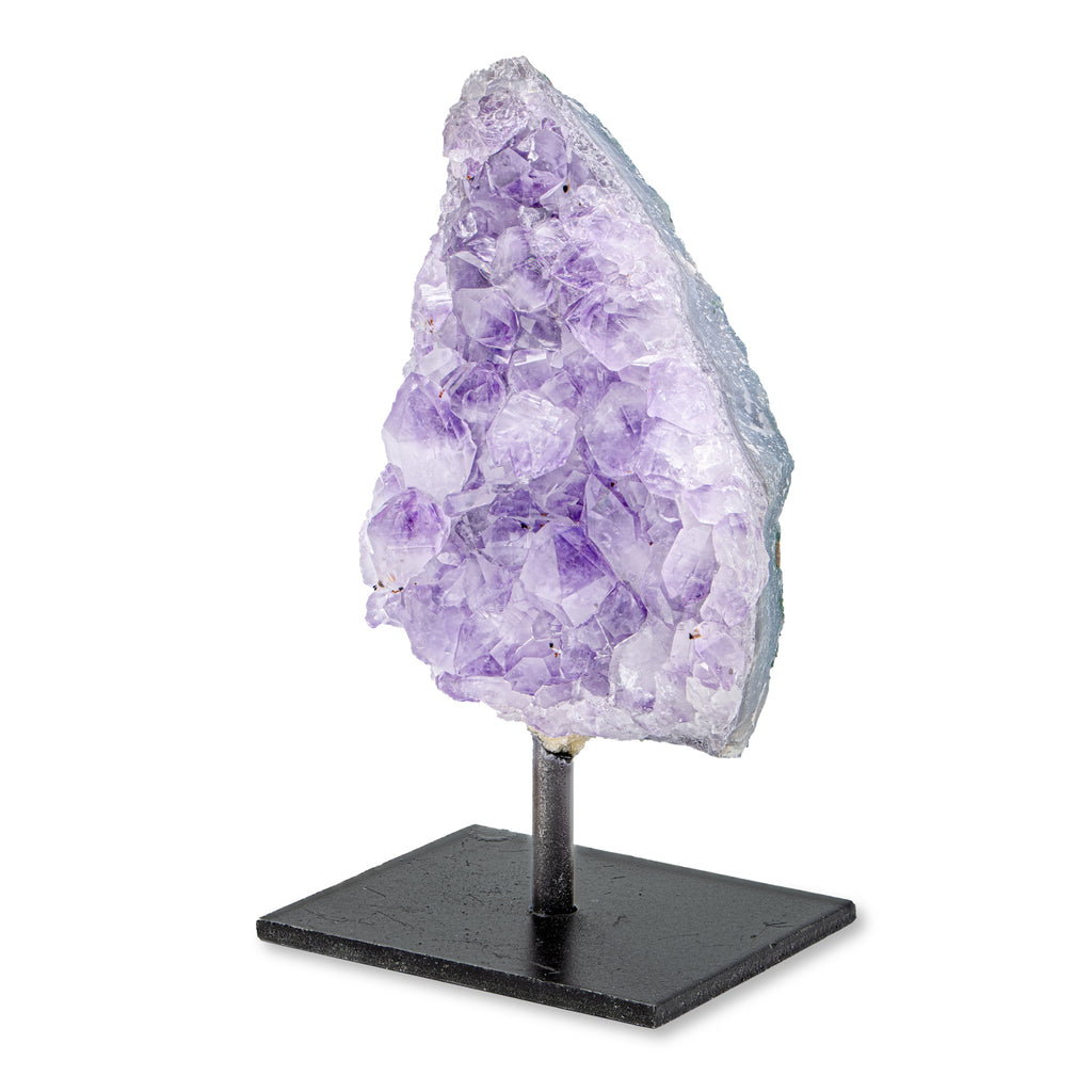 Each amethyst cluster comes mounted on a classic black metal stand with a sturdy base. Each cluster is a completely unique arrangement of crystals from a different geode. All are beautifully unique and show outstanding purple coloration.