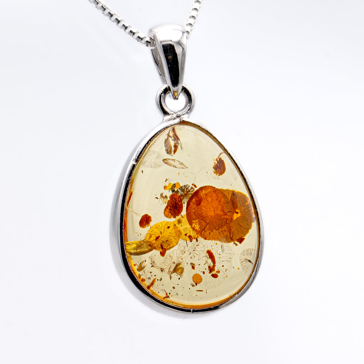 This necklace is made from a teardrop bead of Baltic amber. The exact size and inclusions of each necklace can vary. You can see the exact sizing and look of this showcase jewelry piece above.