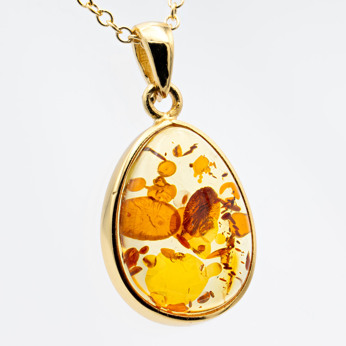 This necklace features a polished bead of fine Baltic amber set into an 18k gold-plated backing. It was recovered from fossil deposits around the Baltic Sea and is estimated to be 40,000,000-60,000,000 years old.