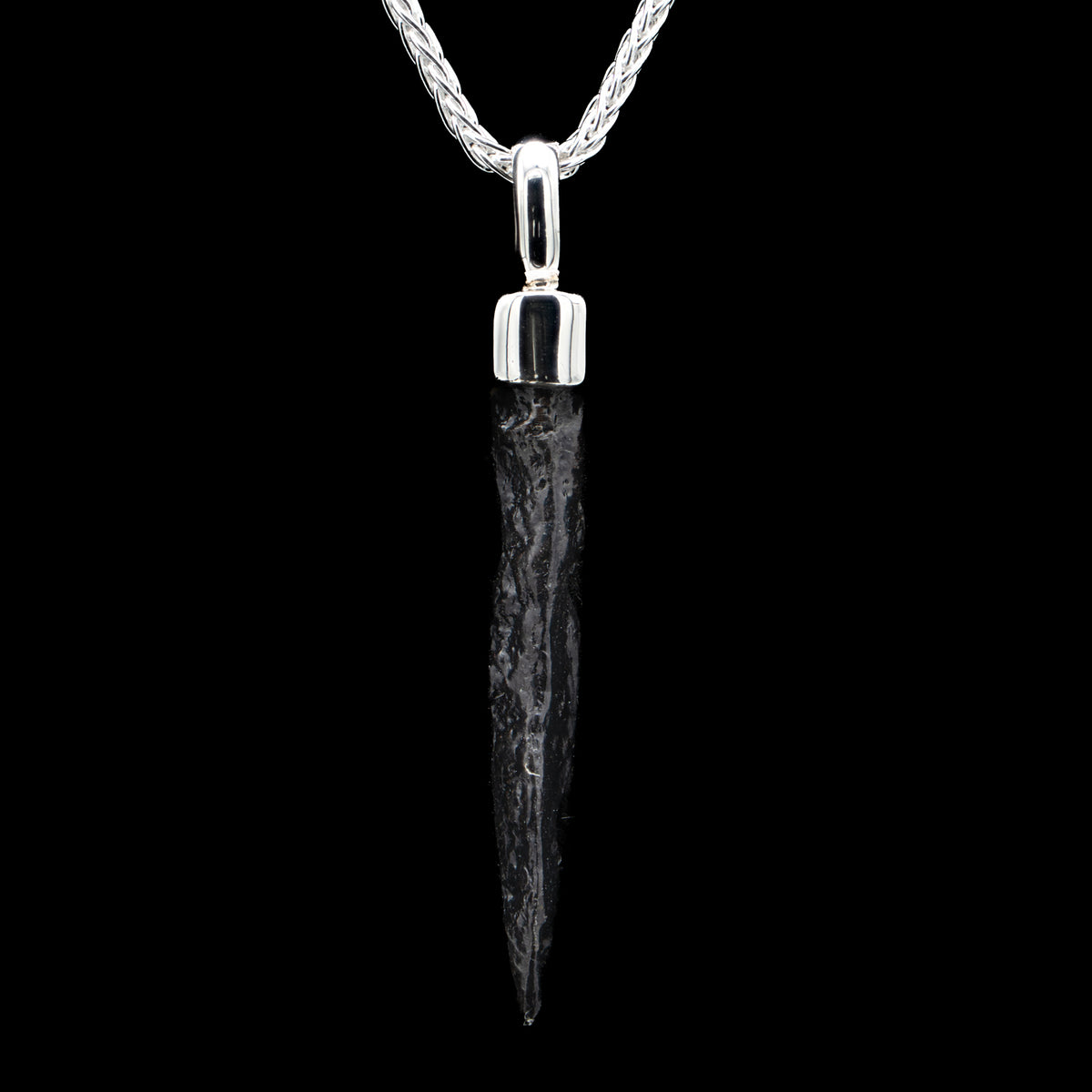 This specimen is a 1.462" Viking arrowhead mounted as a pendant necklace. The arrowhead dates to roughly 900 CE.
