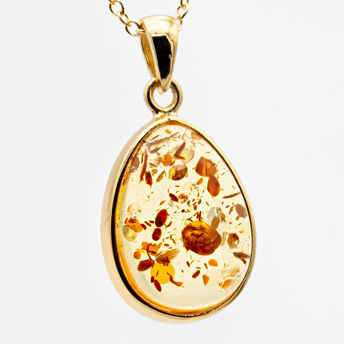 This necklace features a polished bead of fine Baltic amber set into an 18k gold-plated backing. It was recovered from fossil deposits around the Baltic Sea and is estimated to be 40,000,000-60,000,000 years old.