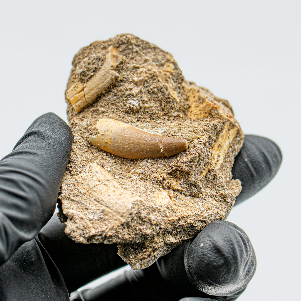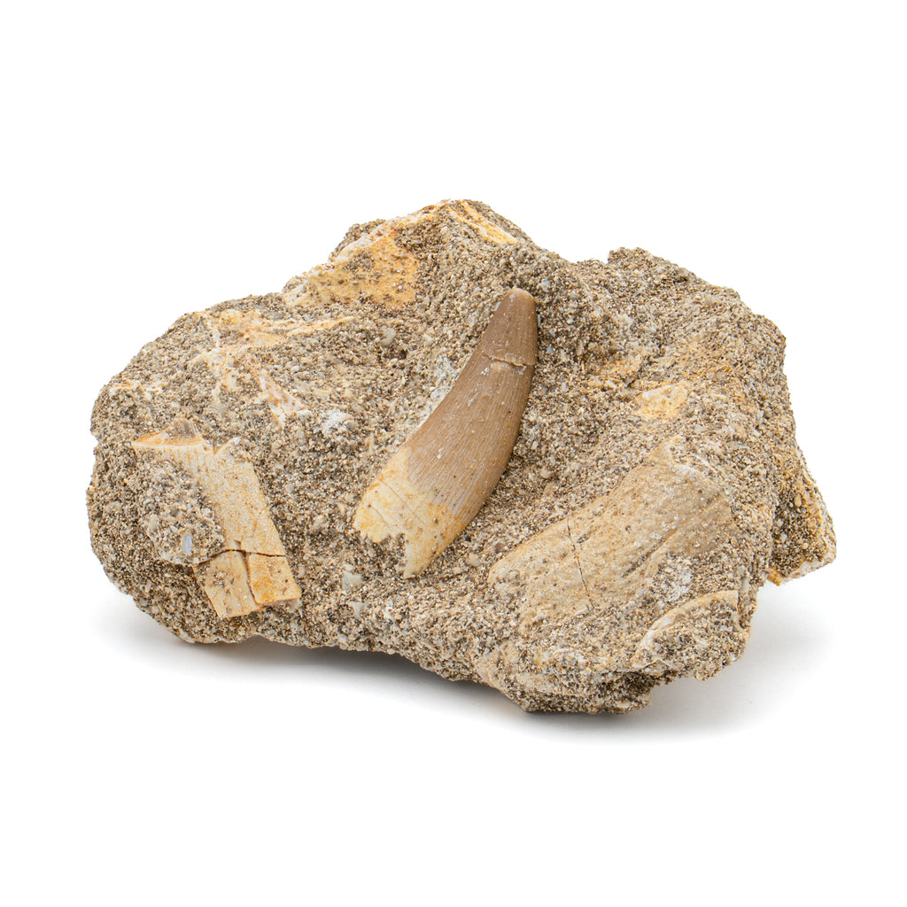 This specimen is a Plesiosaur tooth embedded in matrix. It was recovered from deposits in Morocco and dates to the Late Cretaceous Period.
