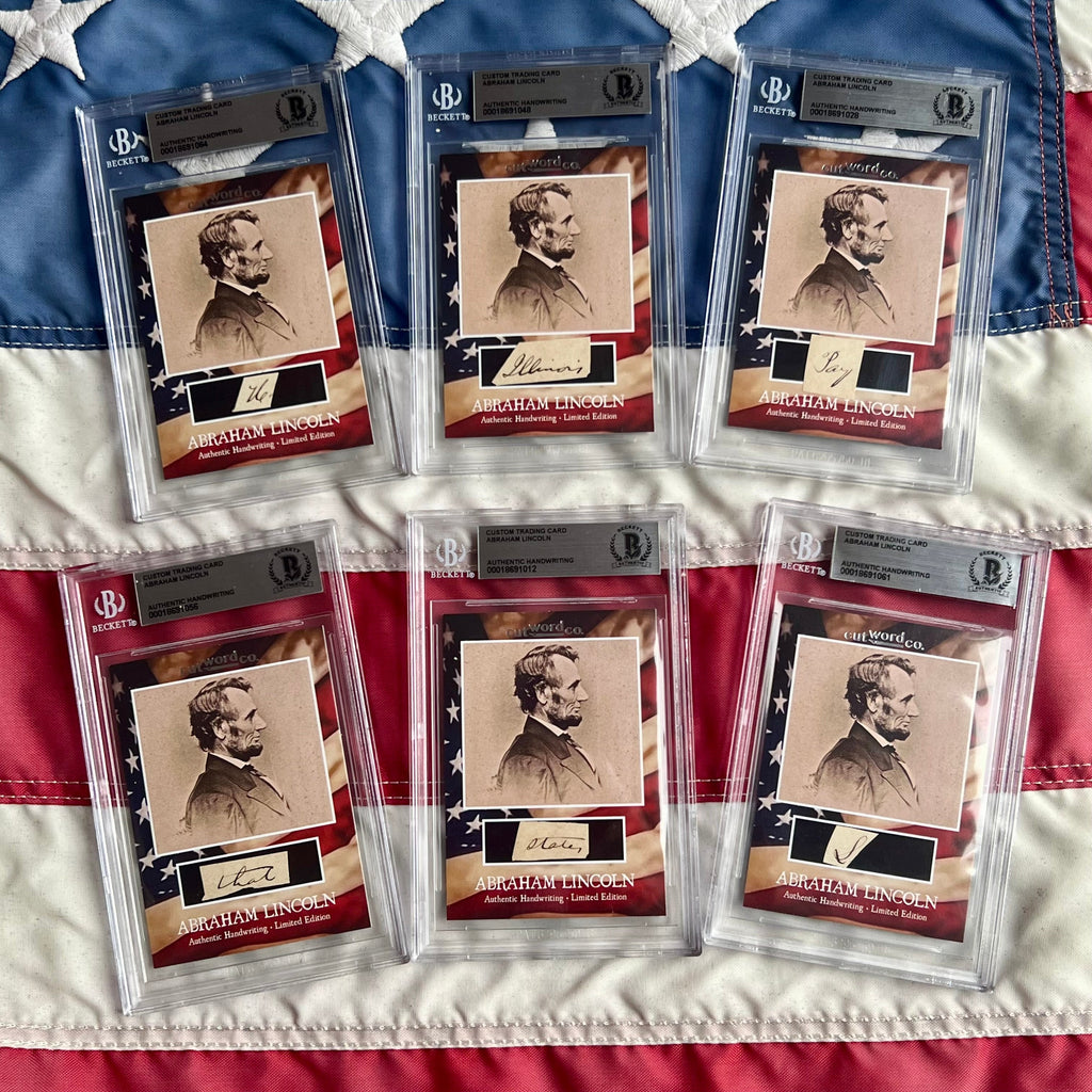 Each encapsulated word was individually removed from an 1842 legal document drafted in Lincoln’s own hand, referencing a note held by Logan and the collection of a debt owed to him. Handwriting is mounted to a custom card from our friends at CutWordCo and set in a standard-sized Beckett holder.