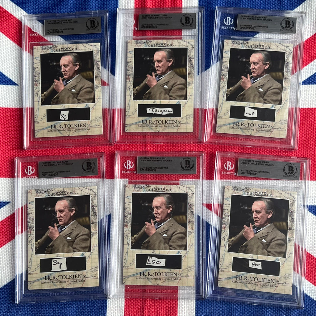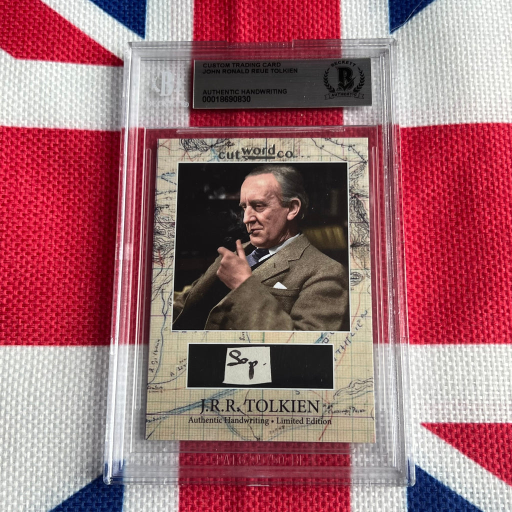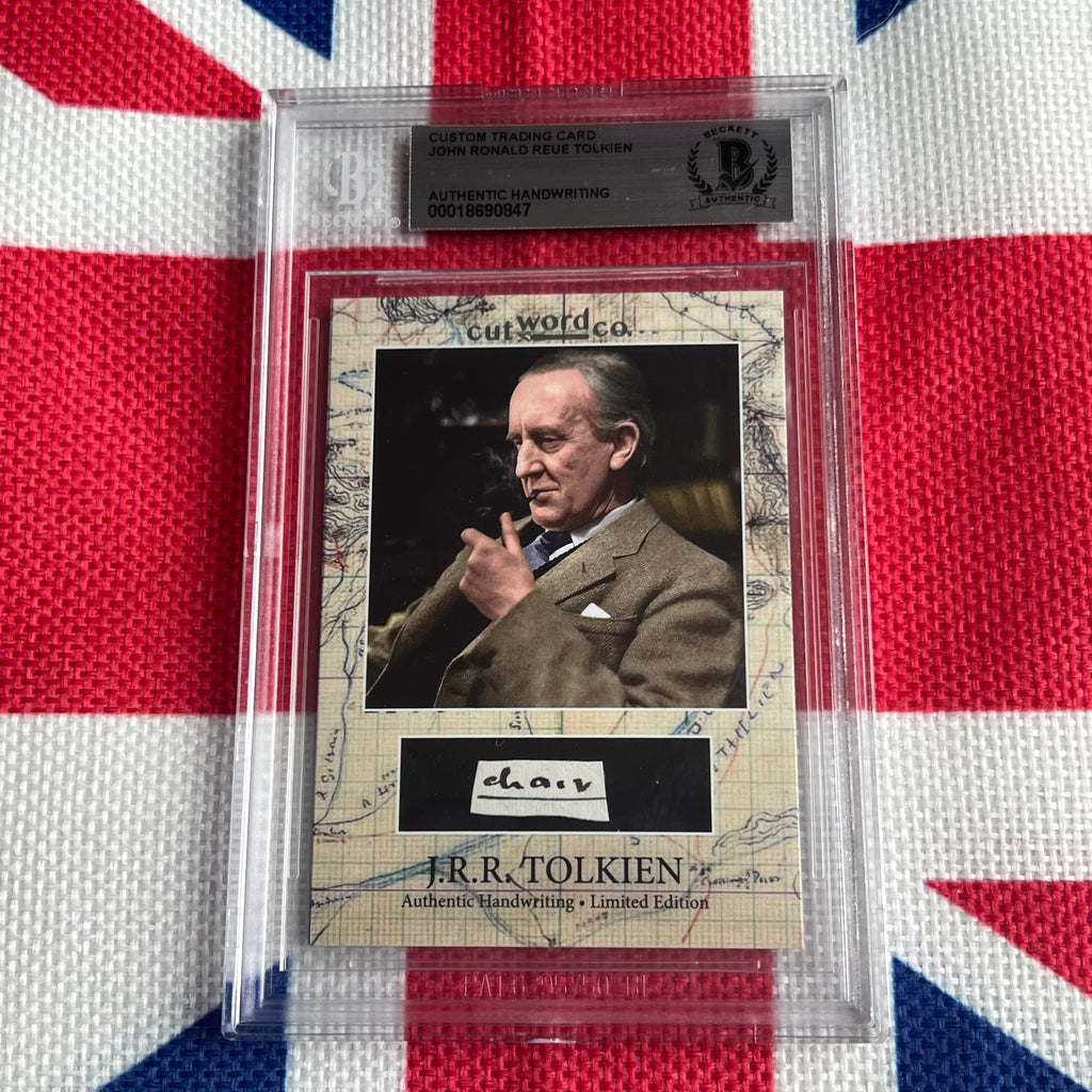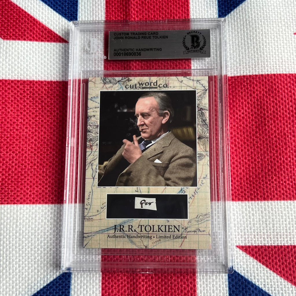A limited edition item from our friends at CutWordCo, each order will include one Tolkien handwriting fragment selected from the dropdown menu. Each word in the dropdown menu is an actual word handwritten by Tolkien. Handwriting is mounted to a custom card from our friends at CutWordCo and set in a standard-sized Beckett holder.