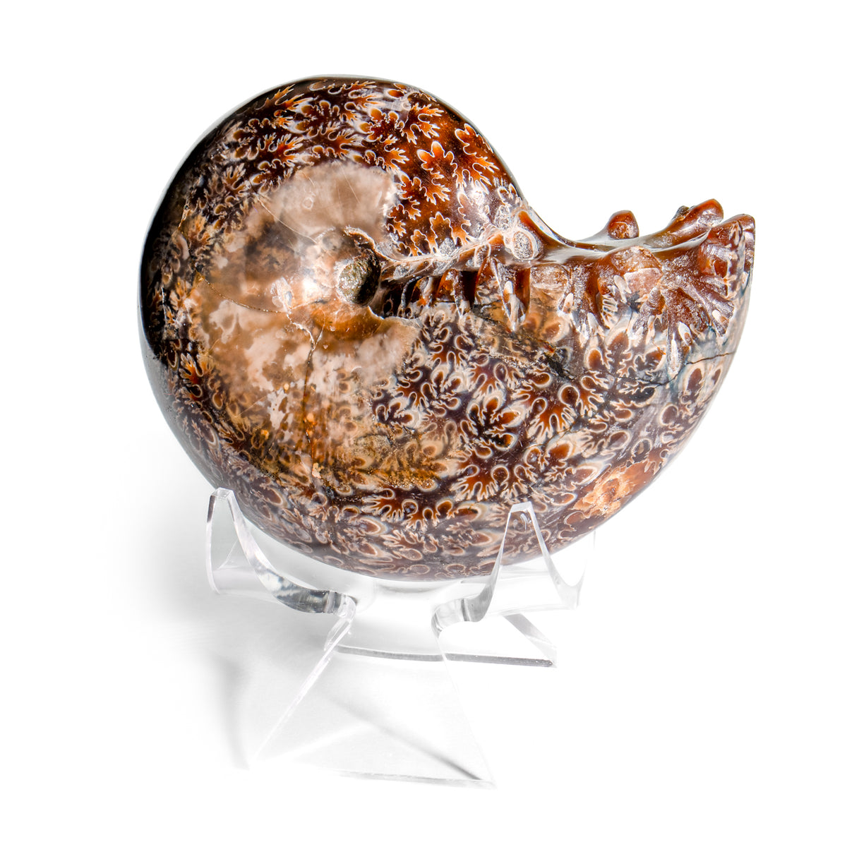This particular genus of ammonite had beautiful suture patterns that cross their shells like feathered jigsaw pieces and make fantastic display pieces. A stand and informational card is included with each fossil.
