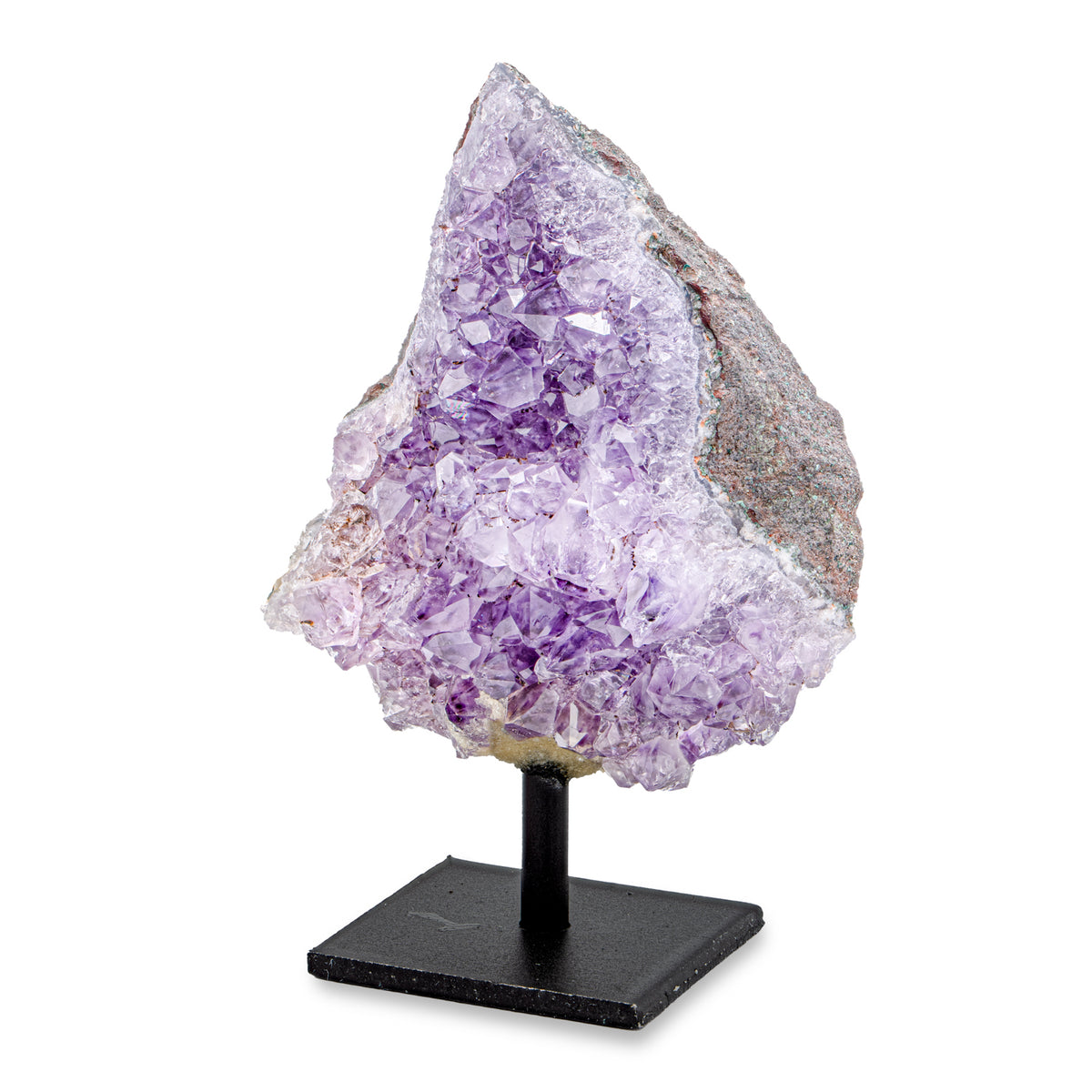 Each amethyst cluster comes mounted on a classic black metal stand with a sturdy base. Each cluster is a completely unique arrangement of crystals from a different geode. All are beautifully unique and show outstanding purple coloration.