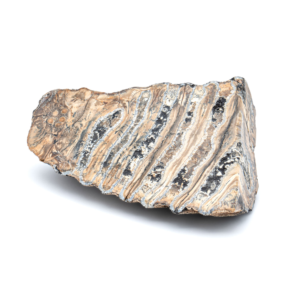This specimen is a beautifully polished cross-section of a Woolly Mammoth tooth. During the Pleistocene, these majestic creatures roamed the Earth and were a great bounty to our ancient ancestors.