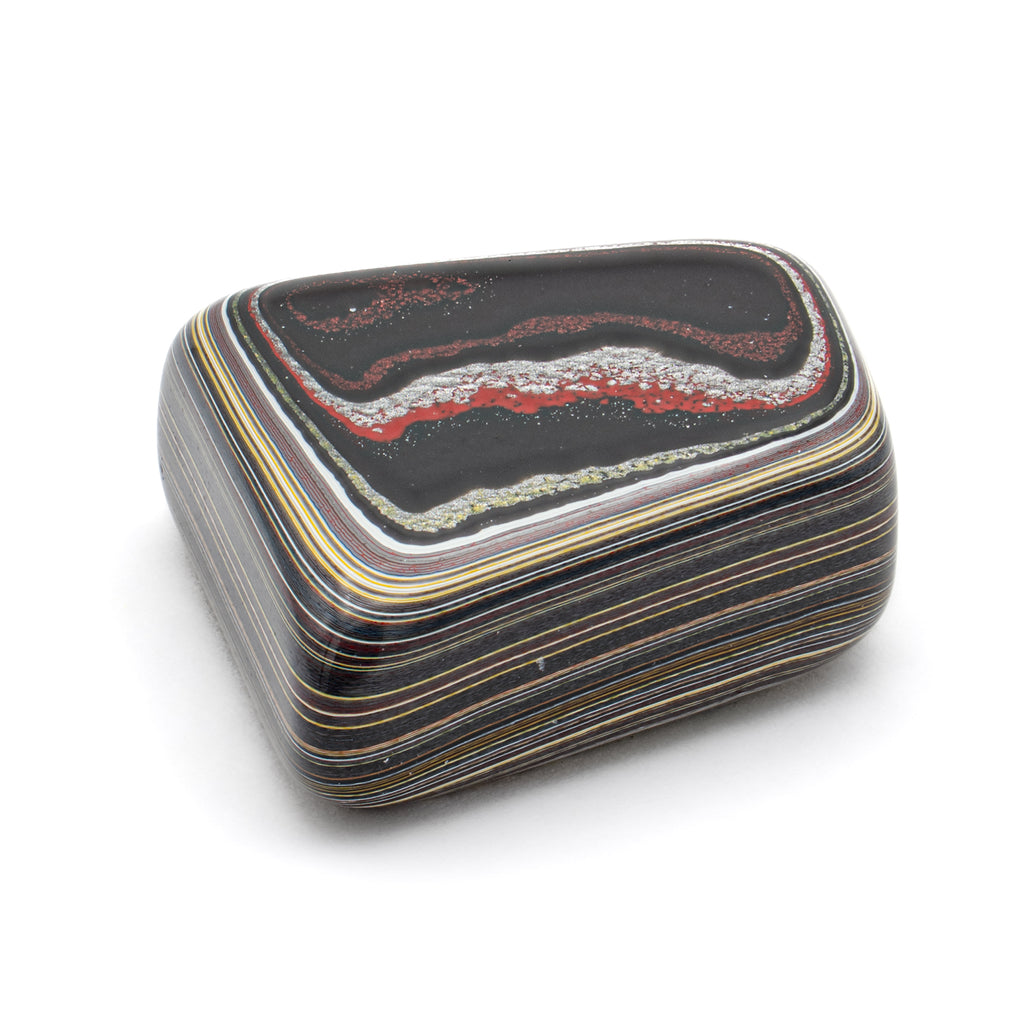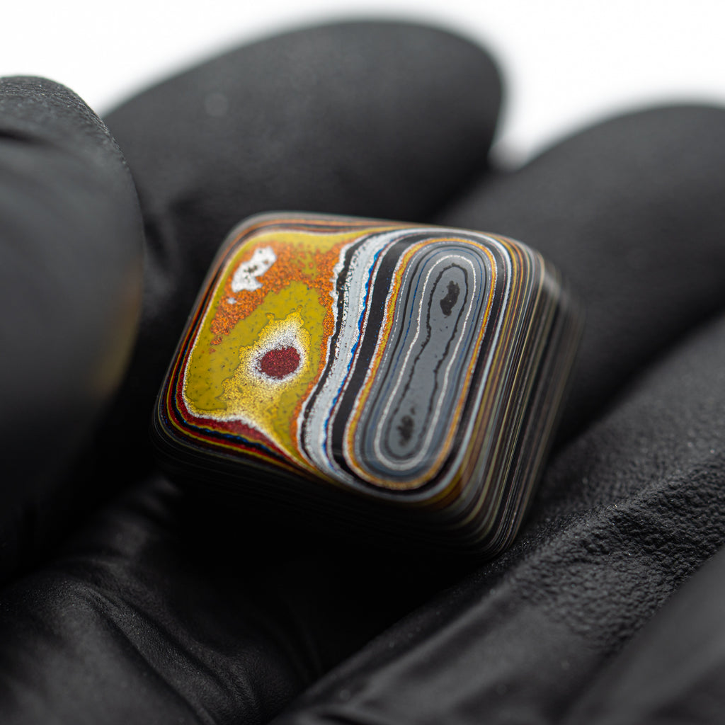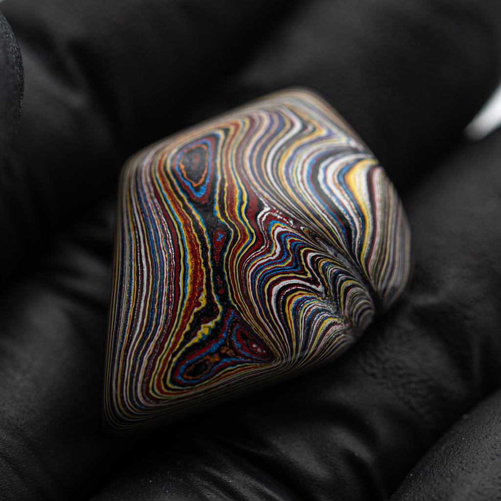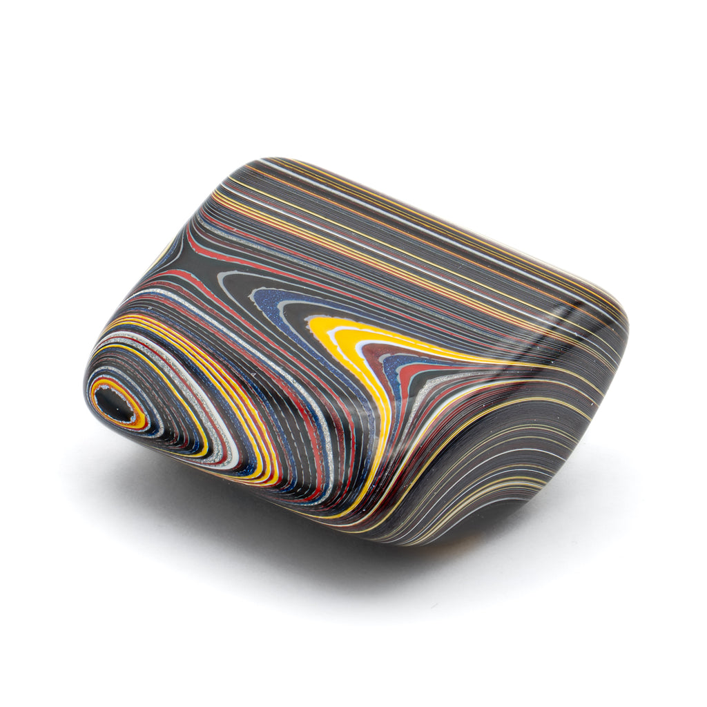 During the post-war Golden Age of Automobiles, factory workers from several different manufacturers discovered something curious. During the painting process, layers upon layers of automobile paint would accumulate into a layered and beautiful material. When heated and polished, this man-made "motor agate" reveals the colors of the cars that once passed through these factories.