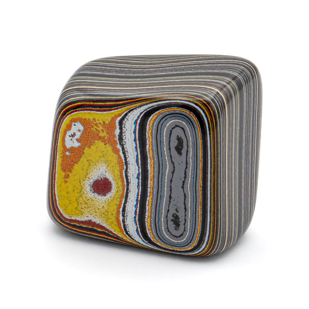 This specimen is a refined piece of Corvettite, which has been cut and smoothed to show the beautiful colors and patterns of the material. Each specimen is completely unique and no two are the same.