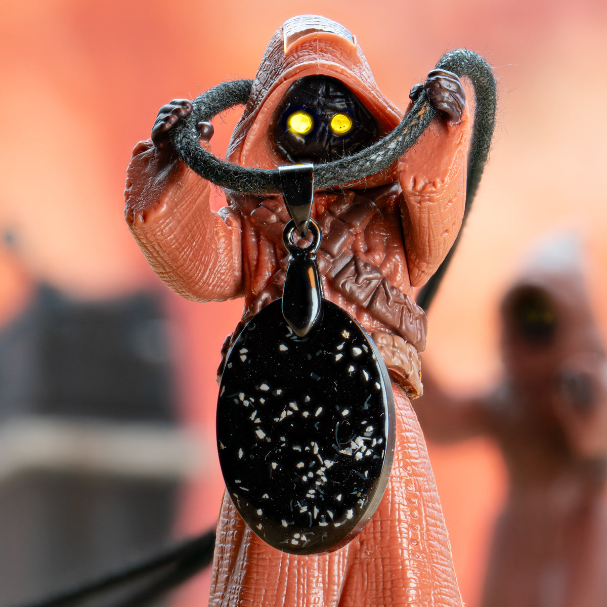 This pendant contains fragments of the fiberglass from Star Wars Episode IV's "Krayt Dragon" prop, the long serpentine skeleton C-3PO encounters soon after separating from R2-D2 on Tatooine.