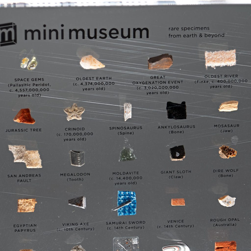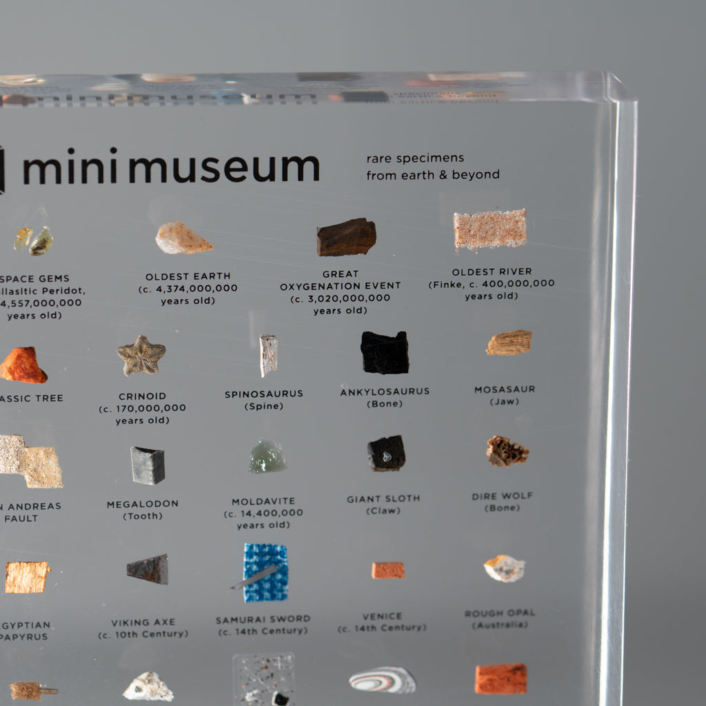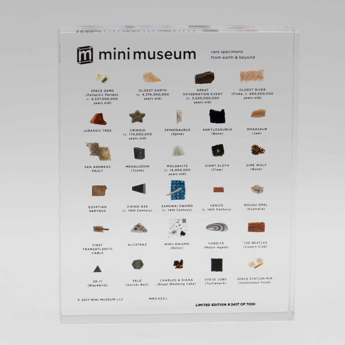 The Mini Museum is a handcrafted, limited edition collectible. The unique specimens are artfully arranged and clearly labeled. The entire collection is encased in Lucite acrylic and designed to inspire for generations.