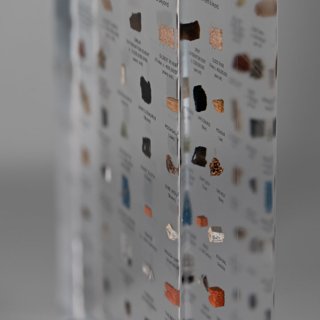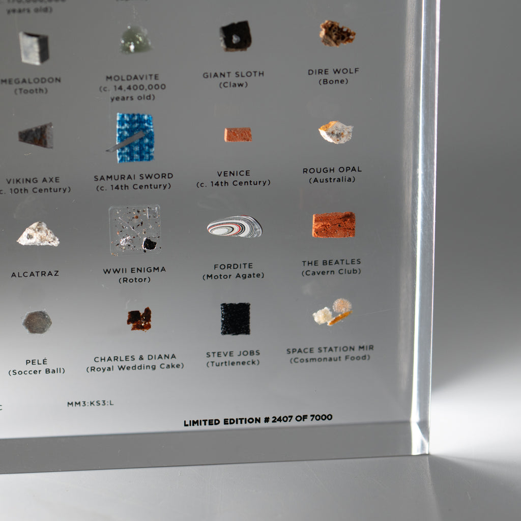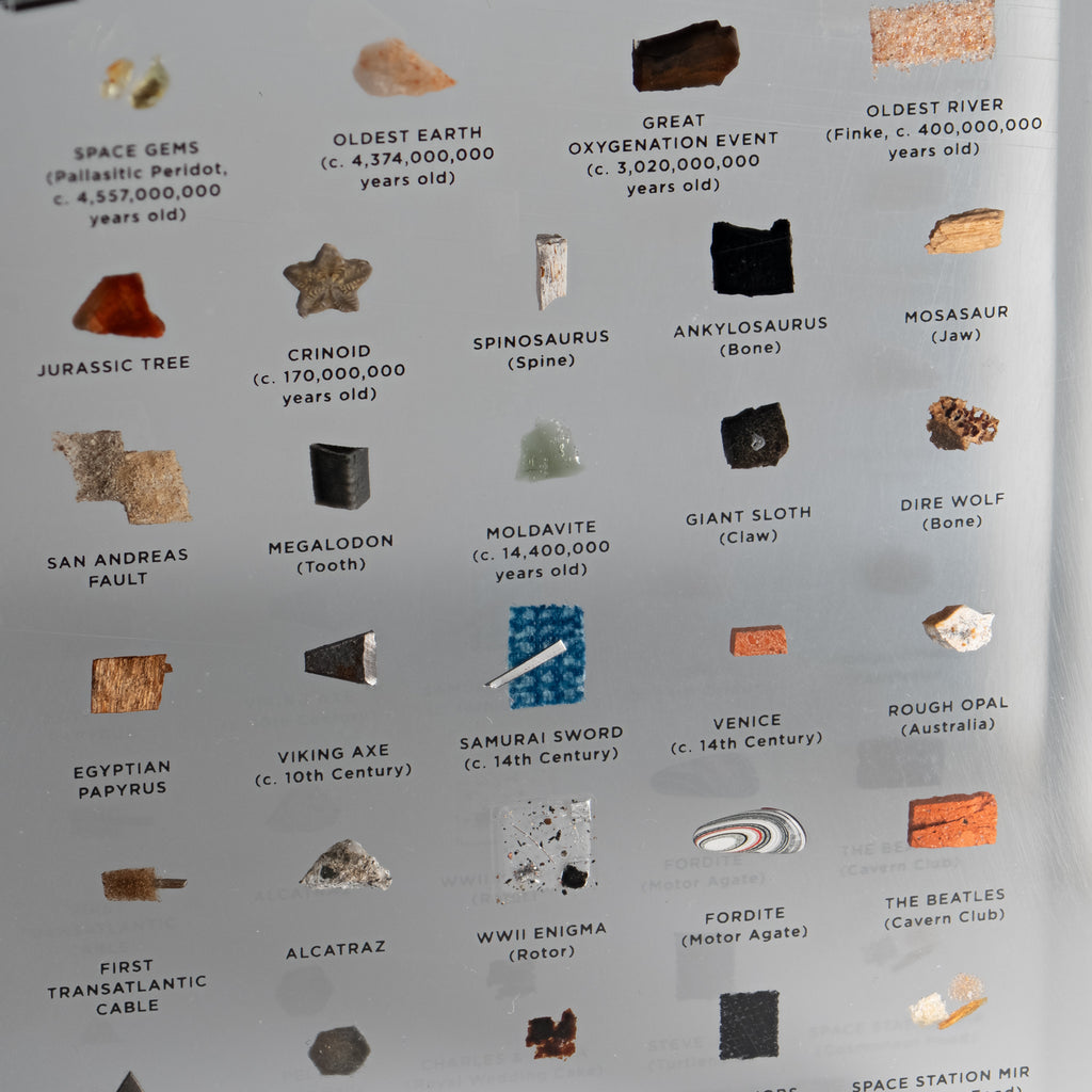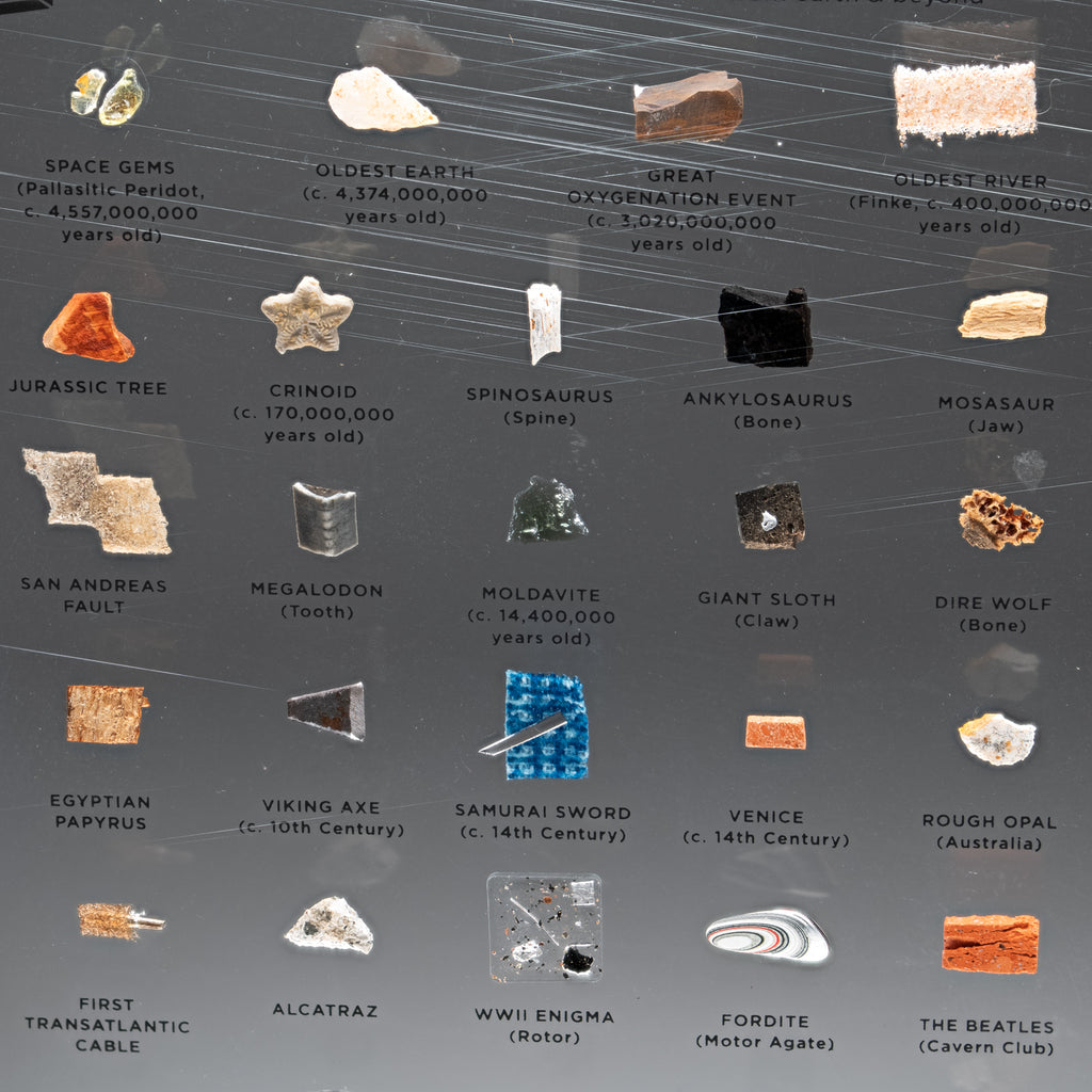 Space Gems, Oldest Earth, The Great Oxygen Event, Oldest River, Jurassic Tree, Crinoid, Spinosaurus Spine, Ankylosaurus Armor, The San Andreas Fault, Megalodon Tooth, Moldavite, Giant Sloth Claw, Dire Wolf, Egyptian Papyrus, Viking Axe, Samurai Sword, Venice Street Brick, Australian Rough Opal, First Transatlantic Cable, Alcatraz, WW II Enigma Machine Rotor, Fordite Motor Agate, The Beatles Cavern Club, SR-71 Blackbird, Pelé Soccer Ball, Charles & Diana's Royal Wedding Cake, Steve Jobs's Turtleneck (yes, really), Flown Cosmonaut Food from the Mir Space Station