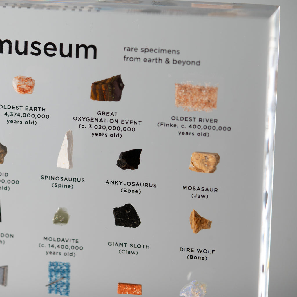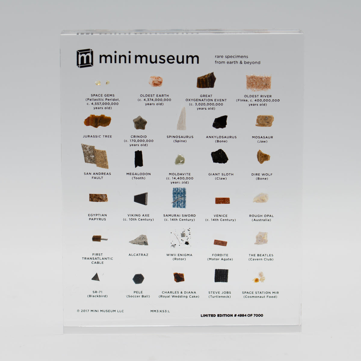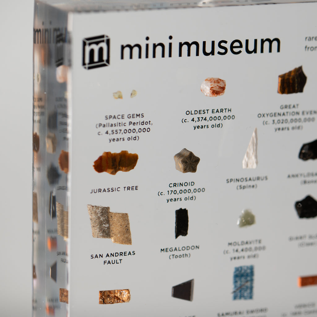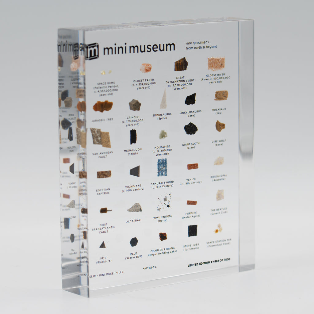 The Mini Museum is a handcrafted, limited edition collectible. The unique specimens are artfully arranged and clearly labeled. The entire collection is encased in Lucite acrylic and designed to inspire for generations.