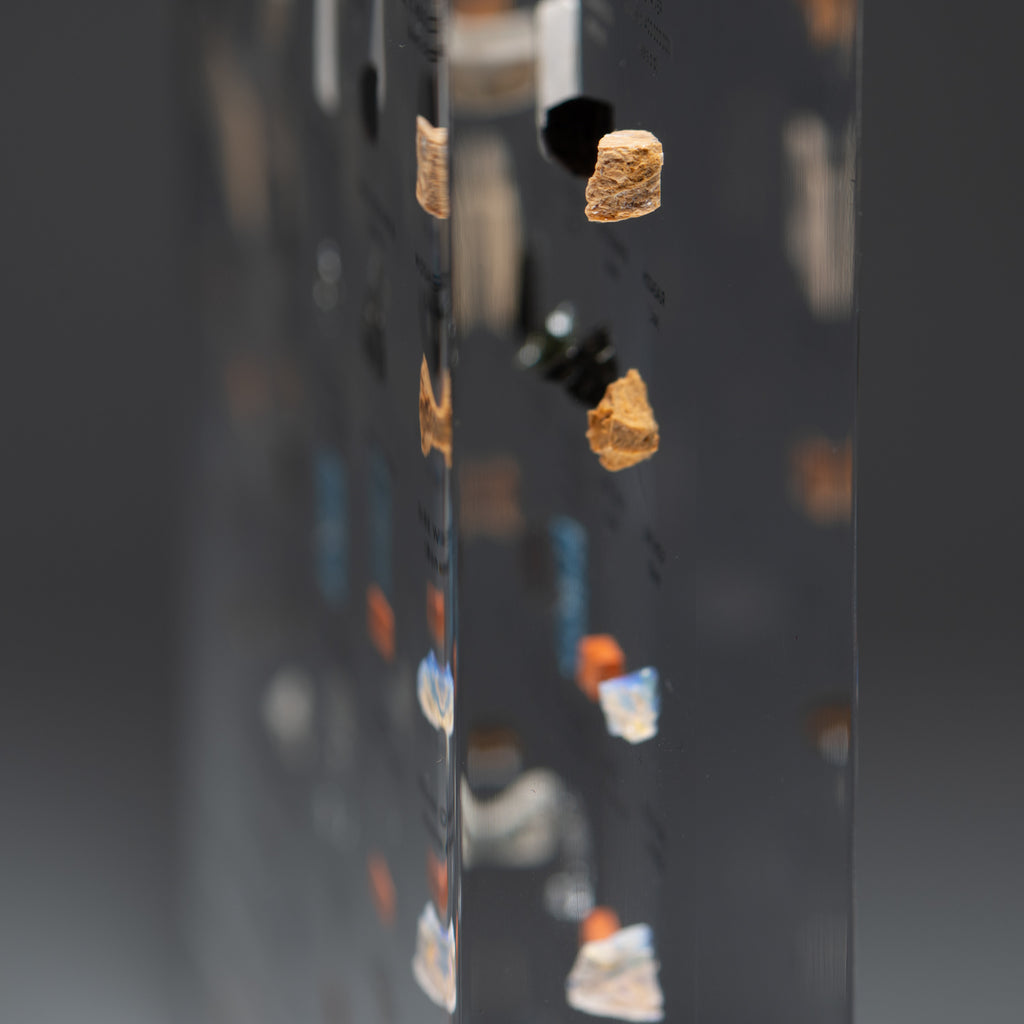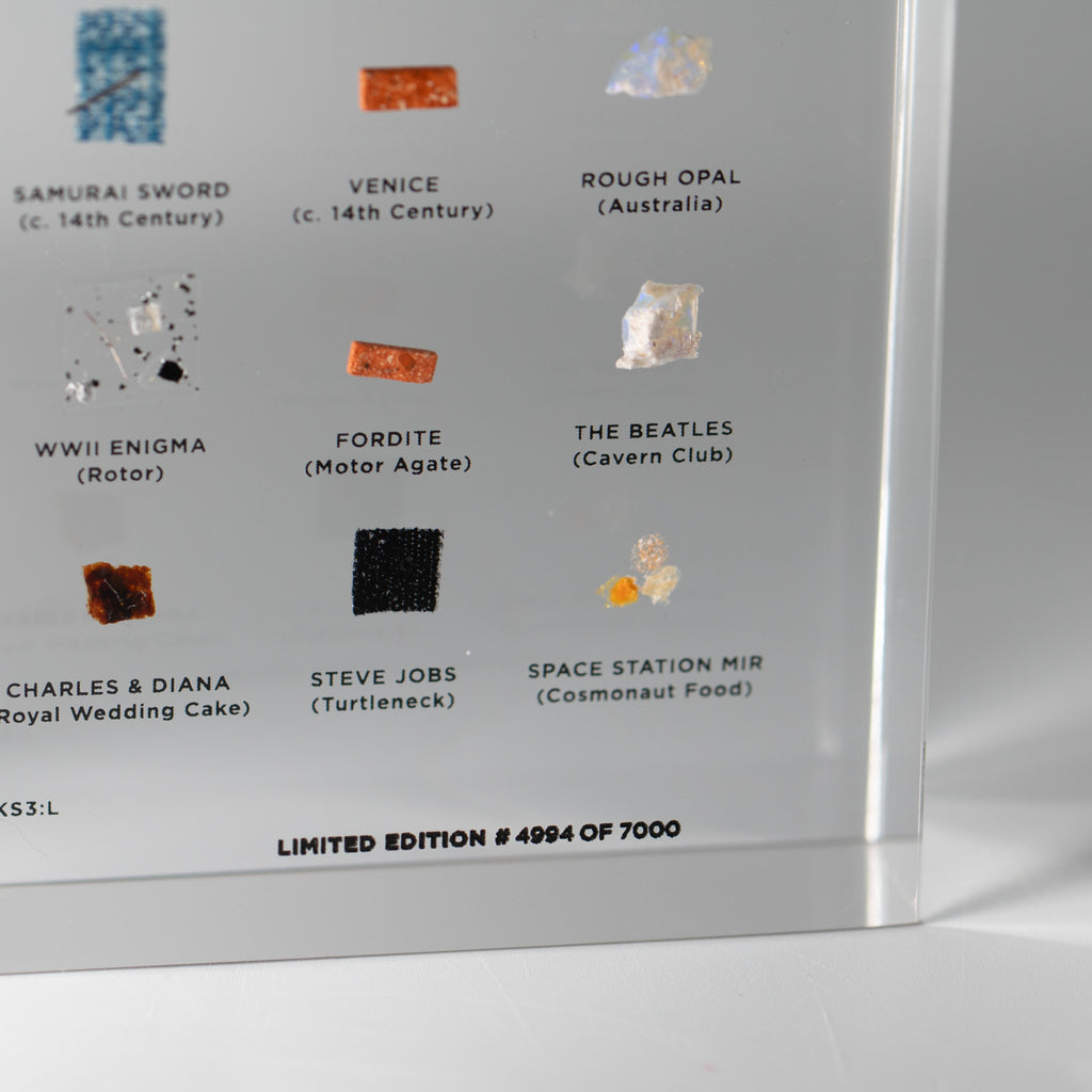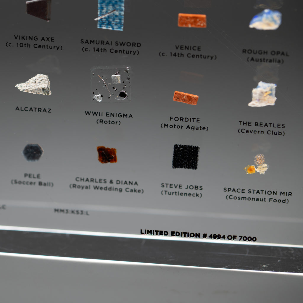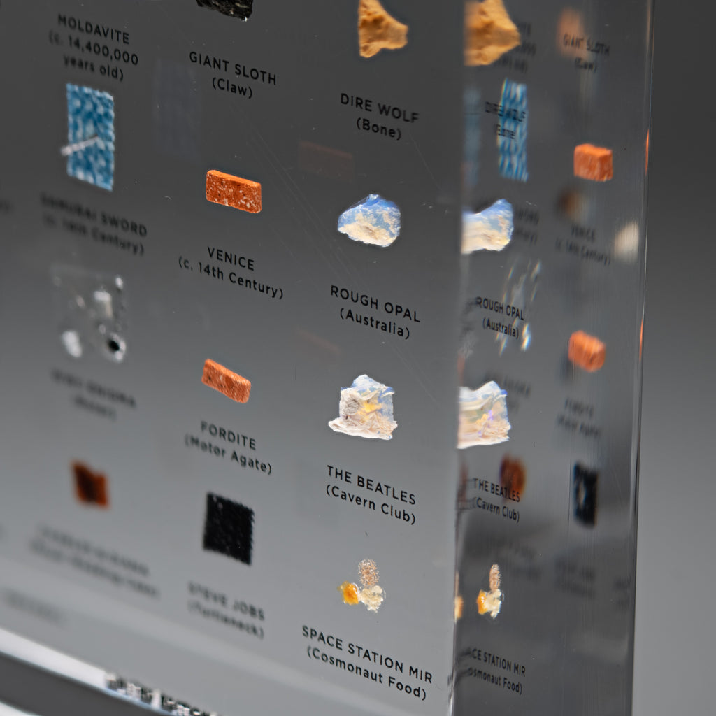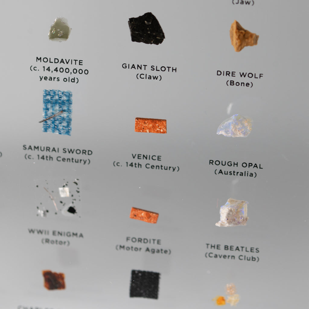 Space Gems, Oldest Earth, The Great Oxygen Event, Oldest River, Jurassic Tree, Crinoid, Spinosaurus Spine, Ankylosaurus Armor, The San Andreas Fault, Megalodon Tooth, Moldavite, Giant Sloth Claw, Dire Wolf, Egyptian Papyrus, Viking Axe, Samurai Sword, Venice Street Brick, Australian Rough Opal, First Transatlantic Cable, Alcatraz, WW II Enigma Machine Rotor, Fordite Motor Agate, The Beatles Cavern Club, SR-71 Blackbird, Pelé Soccer Ball, Charles & Diana's Royal Wedding Cake, Steve Jobs's Turtleneck (yes, really), Flown Cosmonaut Food from the Mir Space Station