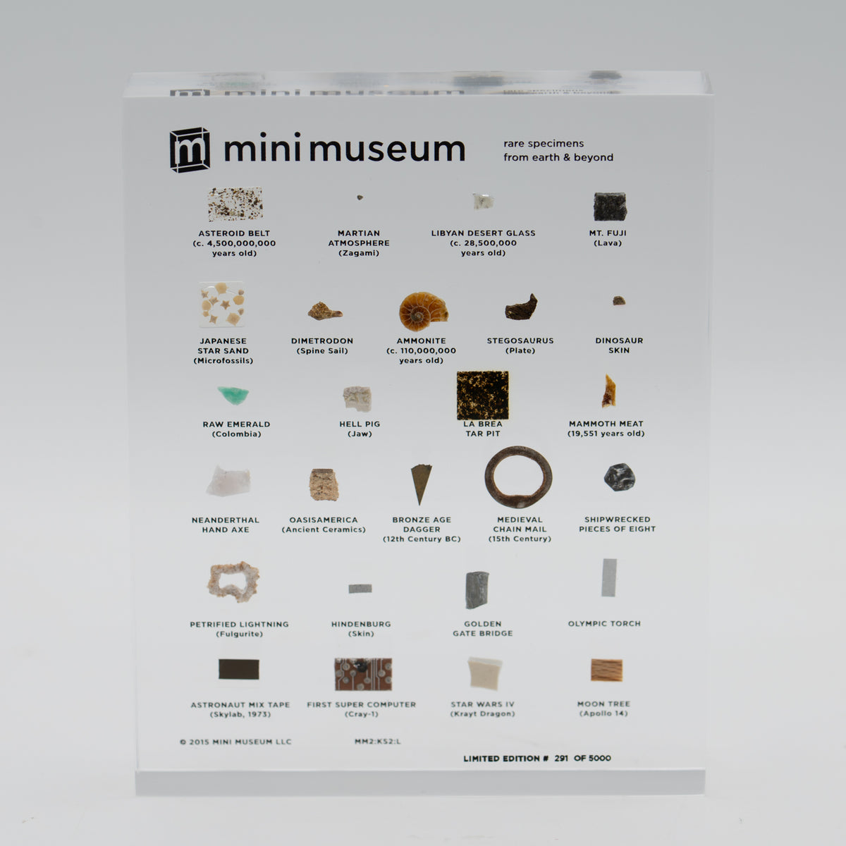 Asteroid Belt (c. 4,500,000,000 Years Old), Martian Atmosphere (Zagami Meteorite), Libyan Desert Glass (c. 28,500,000 Years Old), Mt. Fuji (Lava), Japanese Star Sand (Foraminafera Microfossils), Dimetrodon Spine Sail, Ammonite, Stegosaurus Plate, Dinosaur Skin, Raw Emerald from Colombia, Hell Pig Jaw (Entelodont), La Brea Tar Pit, Mammoth Meat (19,551 Years Old), Neanderthal Hand Axe, Oasisamerica (Ancient Ceramics), Bronze Age Dagger from the 12th Century BCE, Medieval Chain Mail from the 15th Century CE, Shipwrecked Pieces of Eight, Petrified Lightning (Fulgurite), Hindenburg (Airship Skin), the Golden Gate Bridge, Olympic Relay Torch, Astronaut Mix Tape (Skylab, 1973), the First Super Computer (Cray-1), Star Wars Episode IV (Krayt Dragon), Moon Tree (Apollo 14)