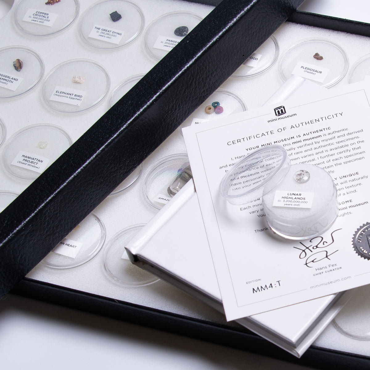 The Mini Museum is a portable collection of curiosities where every item is authentic, iconic and labeled. It's been carefully designed to take you on a journey of learning and exploration. Each Mini Museum is a handcrafted, limited edition; the TOUCH version of the Fourth Edition is limited to just 500 pieces. And If you consider the age of some of these specimens – it's been billions of years in the making.