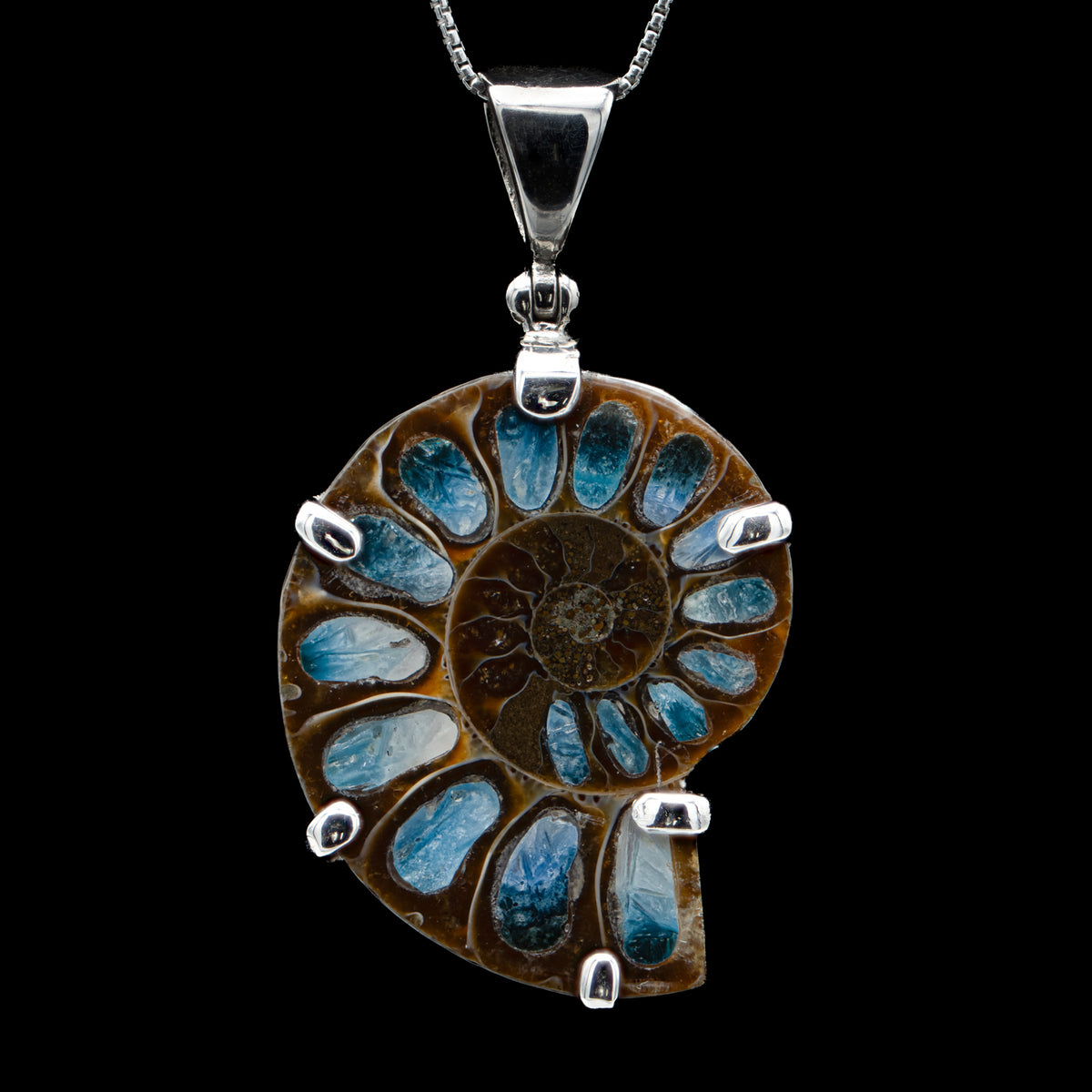 This necklace is a fossilized shell from an ammonite that has been carefully inlaid with “blue ice” glacierite within the shell chambers. This mineral is a sodium-aluminum oxide from Indonesia, which is produced as a byproduct of industrial smelting. This gives a pop of color to the already incredible fossil pendant.