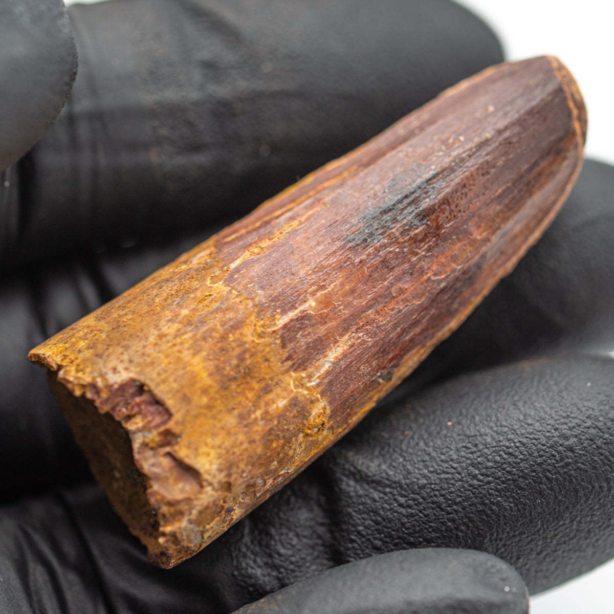 This specimen is a naturally worn, fossilized crown and partial root of a real Spinosaurus tooth from the Kem Kem fossil beds of Morocco. It measures 1.650" in length.