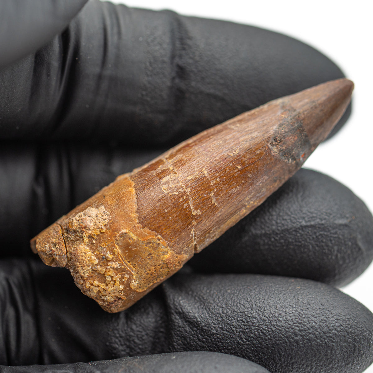 This specimen is a naturally worn, fossilized crown and partial root of a real Spinosaurus tooth from the Kem Kem fossil beds of Morocco. It measures 1.685" in length.