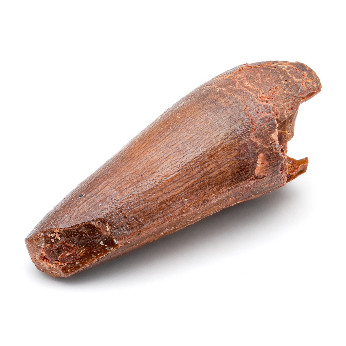 This specimen is a naturally worn, fossilized crown and partial root of a real Spinosaurus tooth from the Kem Kem fossil beds of Morocco. It measures 1.717" in length.