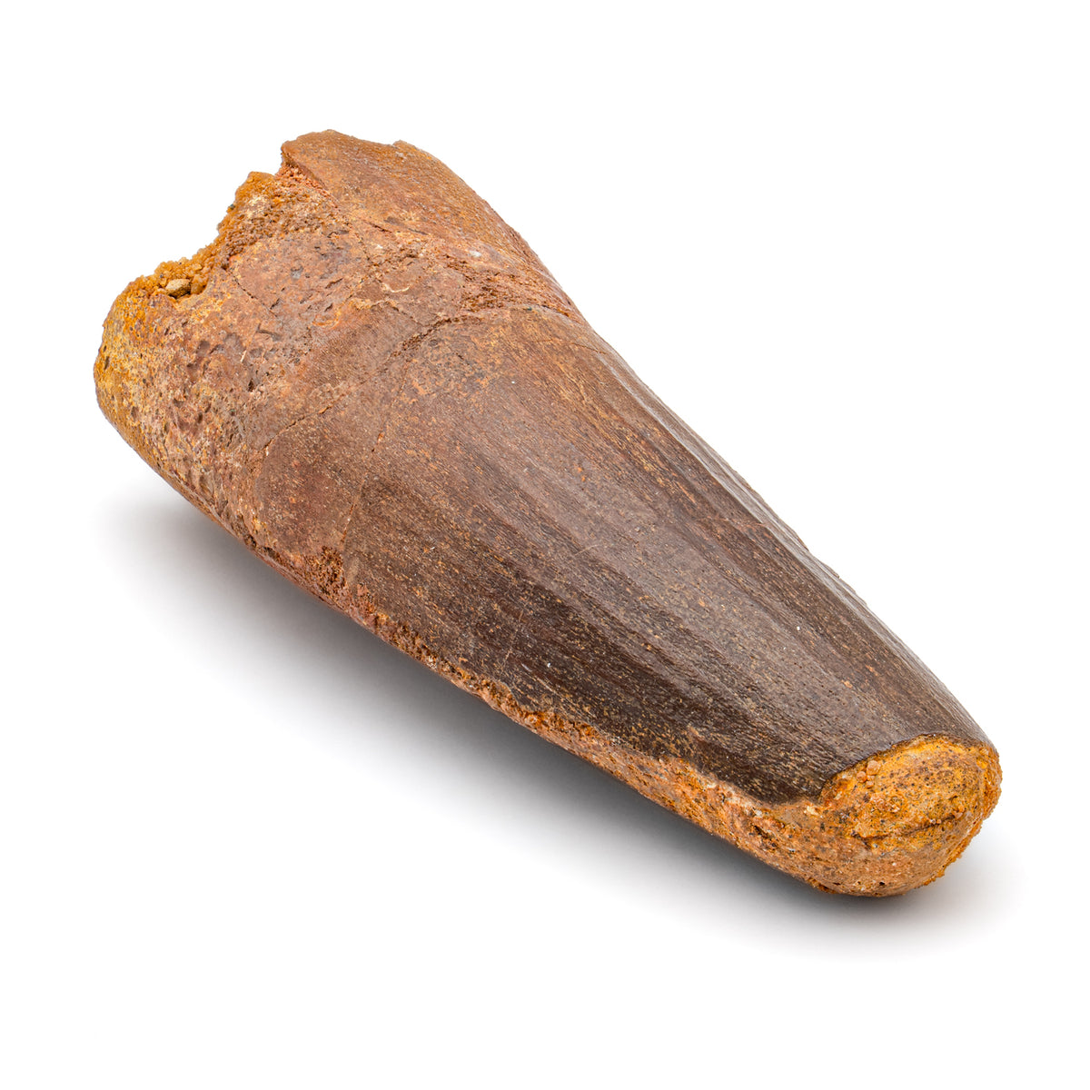 This specimen is a naturally worn, fossilized crown and partial root of a real Spinosaurus tooth from the Kem Kem fossil beds of Morocco. It measures 2.736" in length.