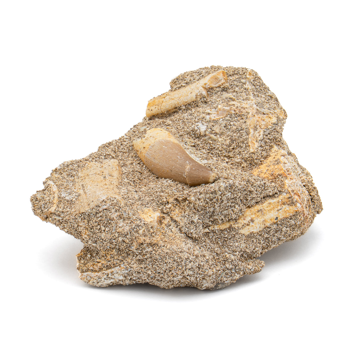 This specimen is a Plesiosaur tooth embedded in matrix. It was recovered from deposits in Morocco and dates to the Late Cretaceous Period.