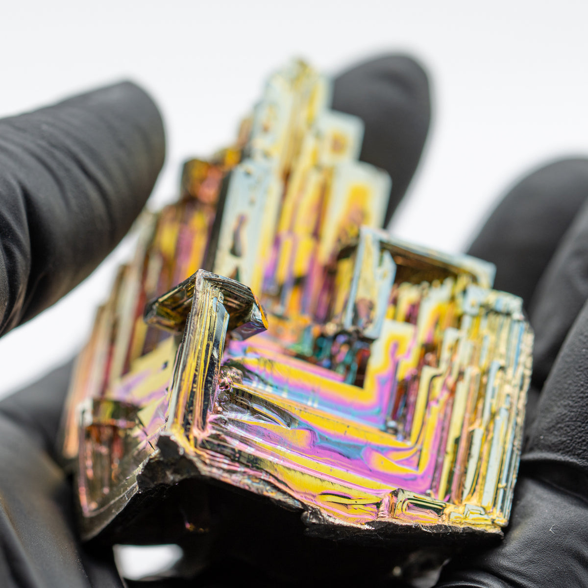 Bismuth is an element (Bi 83) best known for its unusual staircase shape, the result of bismuth atoms attaching to the edge of a rapidly growing crystal. This is called hoppering, when atoms are drawn to the edge of a structure, creating a lattice formation.