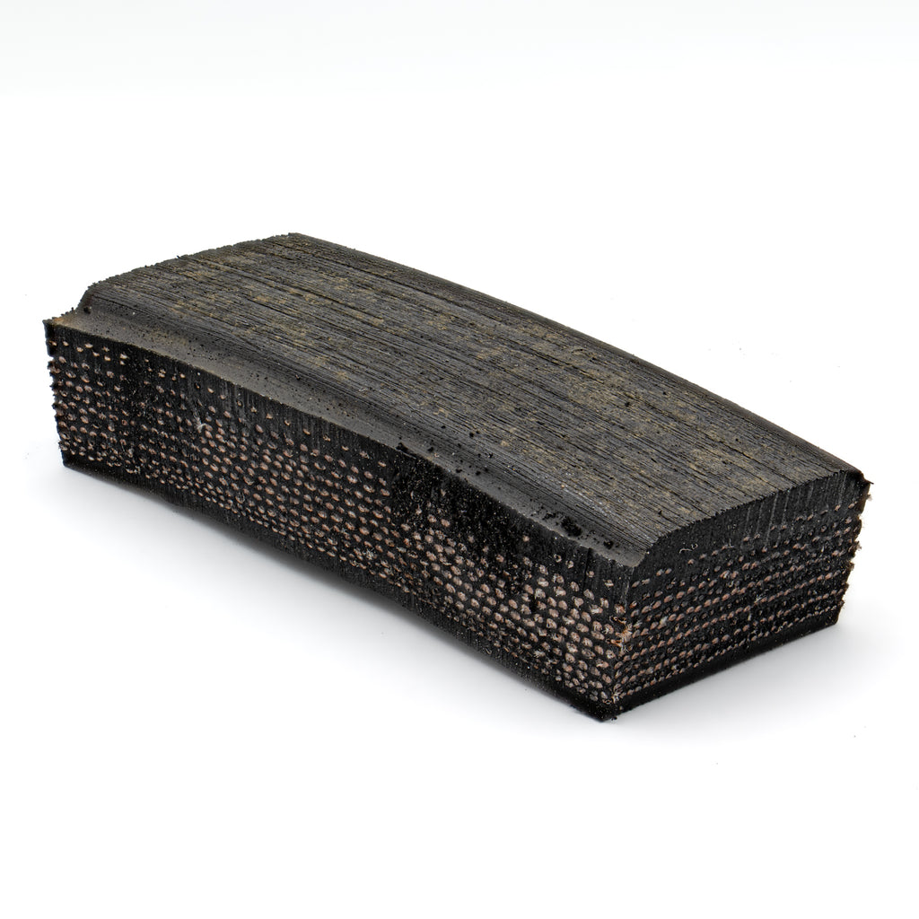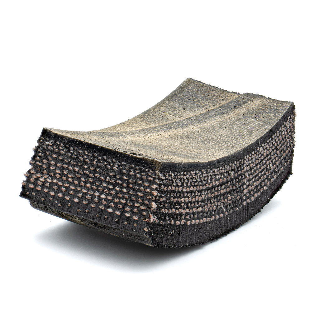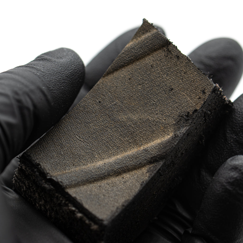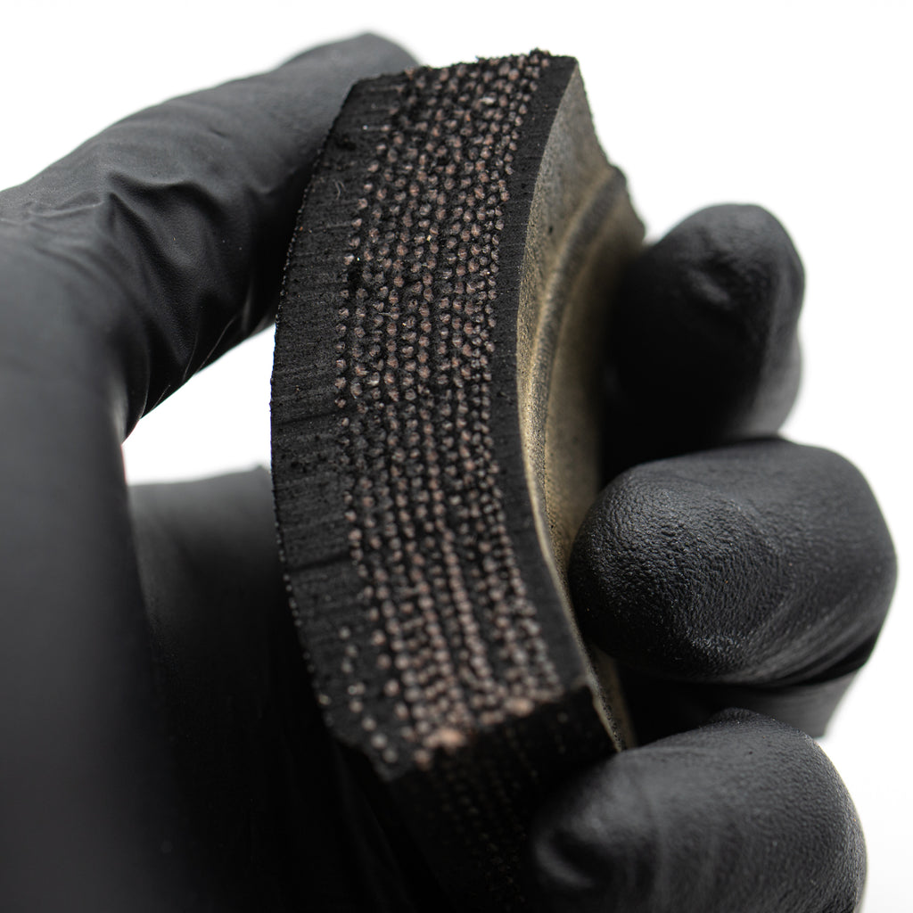 This specimen is a 4.061" mission-flown nose landing gear tire fragment from the Space Shuttle Columbia (OV-102). Serial number verification against public information indicates the tire was removed from service after Columbia's 13th mission (STS-52). This piece includes skid marks from the touchdown of the Space Shuttle during landing. The interior side of this tire section has been stamped with the part identifier 2852-1 by the manufacturer.