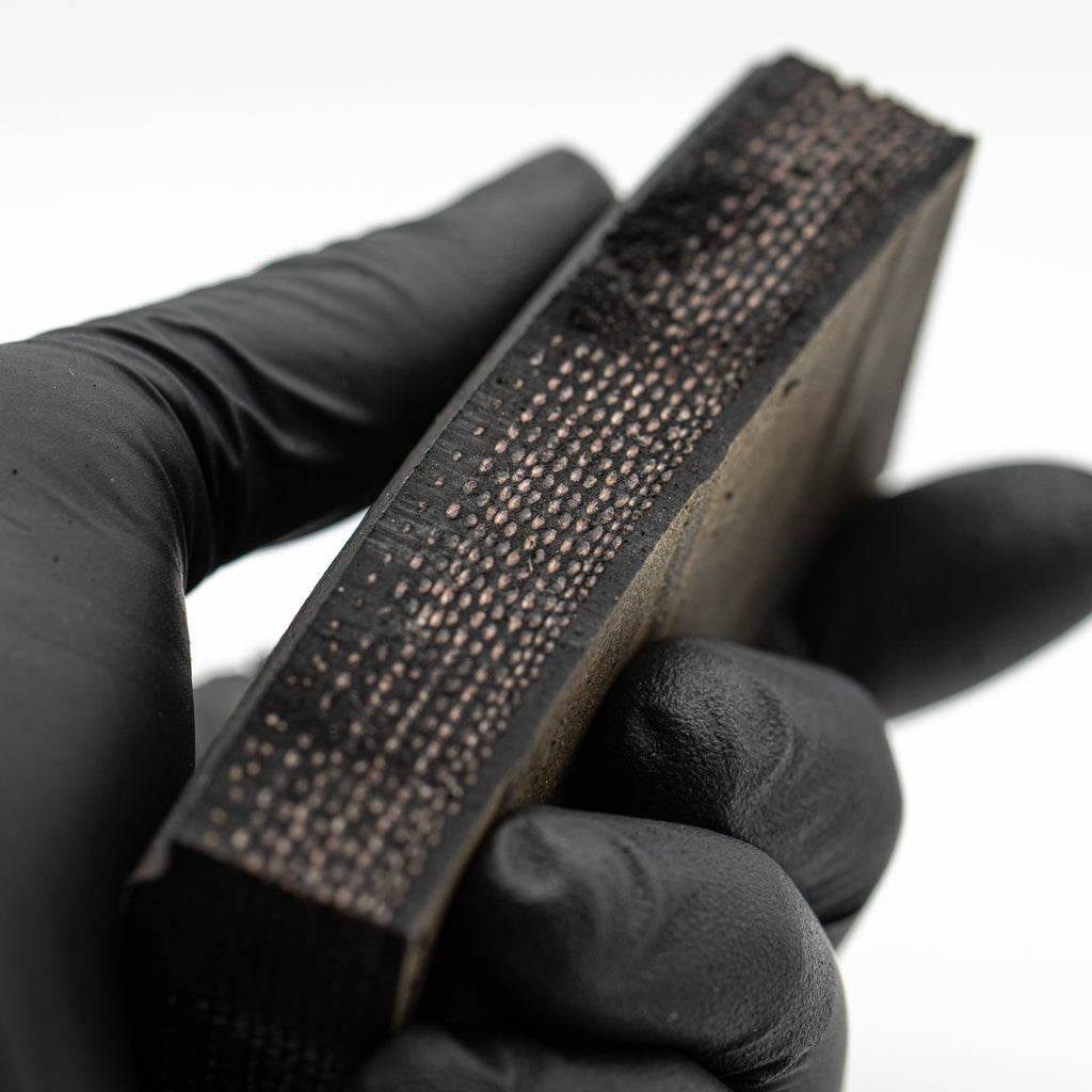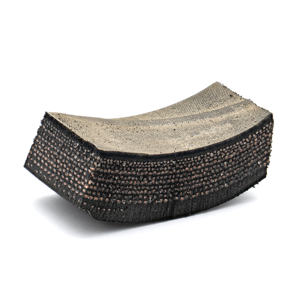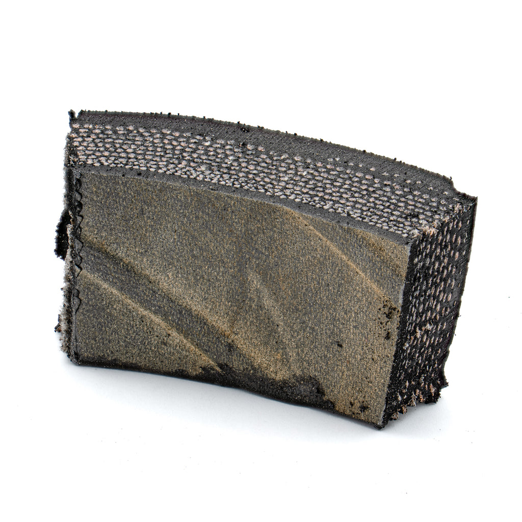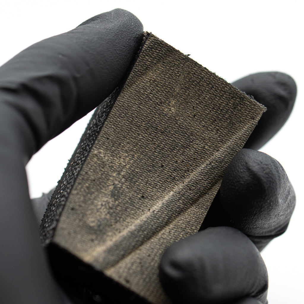 This specimen is a 4.061" mission-flown nose landing gear tire fragment from the Space Shuttle Columbia (OV-102). Serial number verification against public information indicates the tire was removed from service after Columbia's 13th mission (STS-52). This piece includes skid marks from the touchdown of the Space Shuttle during landing. The interior side of this tire section has been stamped with the part identifier 2852-1 by the manufacturer.