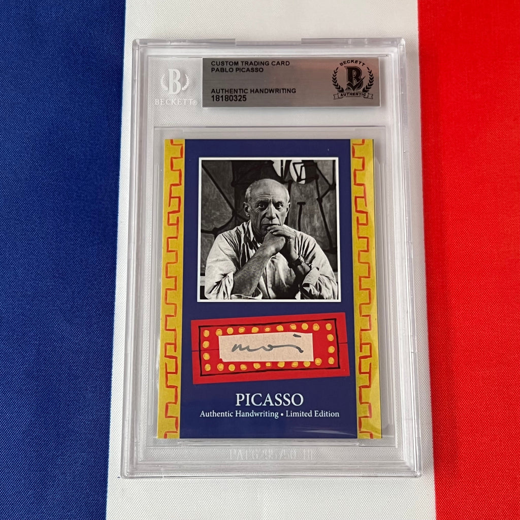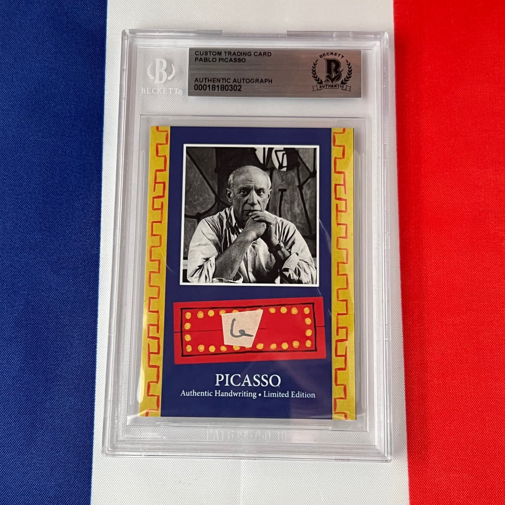 Offered for the first time ever—genuine handwriting from the iconic Spanish artist and modern art master, Pablo Picasso, authenticated and encapsulated by (BAS) Beckett Authentication Services. Each handwritten word was carefully removed from a handwritten letter Picasso sent to his friend and banker, Max Pellequer.