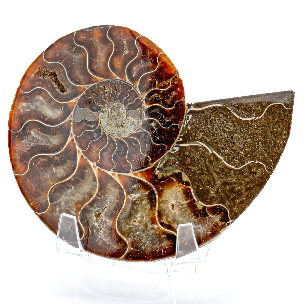 These internal chambers are called septa and the ammonite could fill them with air in order to float through the ocean like a balloon. After millions of years, they are now mineralized with beautiful spiral patterns. A pair of stands and informational card is included the fossil.