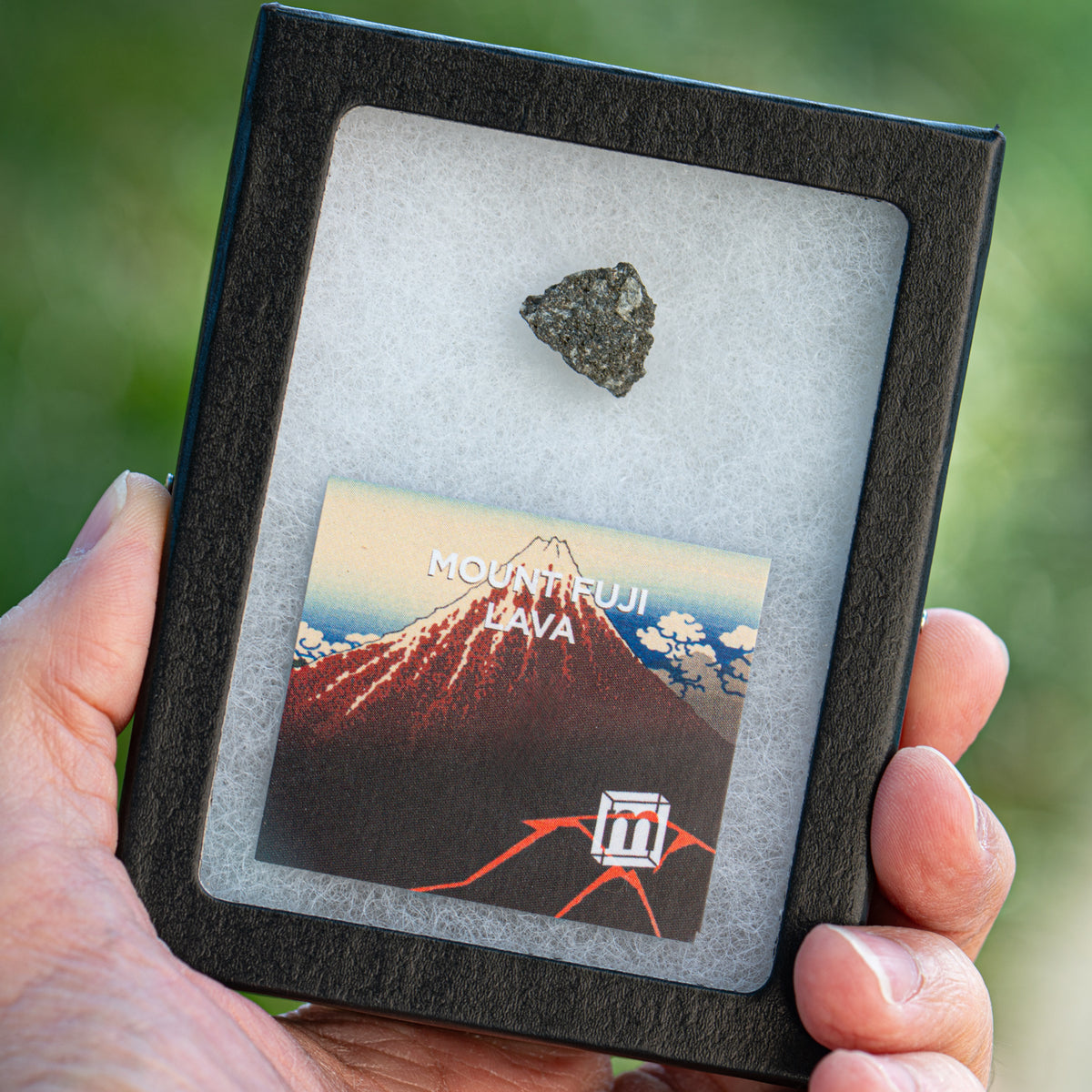 This specimen is a piece of Mount Fuji lava from an erupton that occured in 864 AD. It is housed in a glass-topped riker case for easy examination.