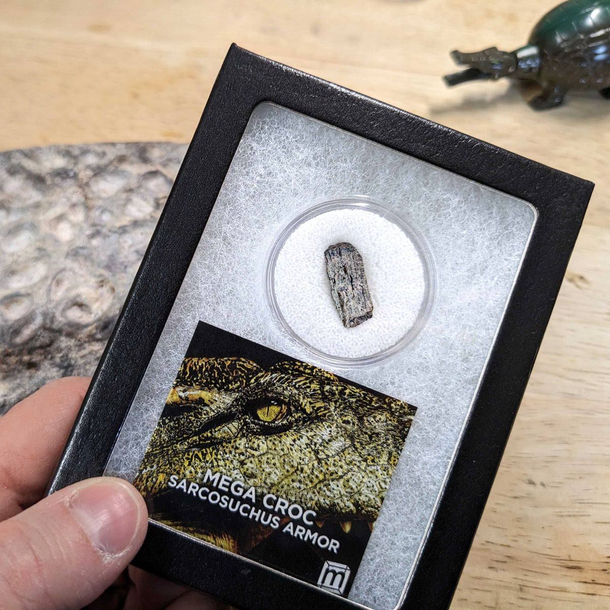 The specimen is a fragment of a Sarcosuchus scute fossil recovered from the Elrhaz Formation in Niger. It is estimated to be 112,000,000 years old. The Sarcosuchus's body was covered in these bony plates which acted as a suit of natural armor. They helped protect the predator during the fight with its prey and allowed them to shrug off blows from competing carnivores.