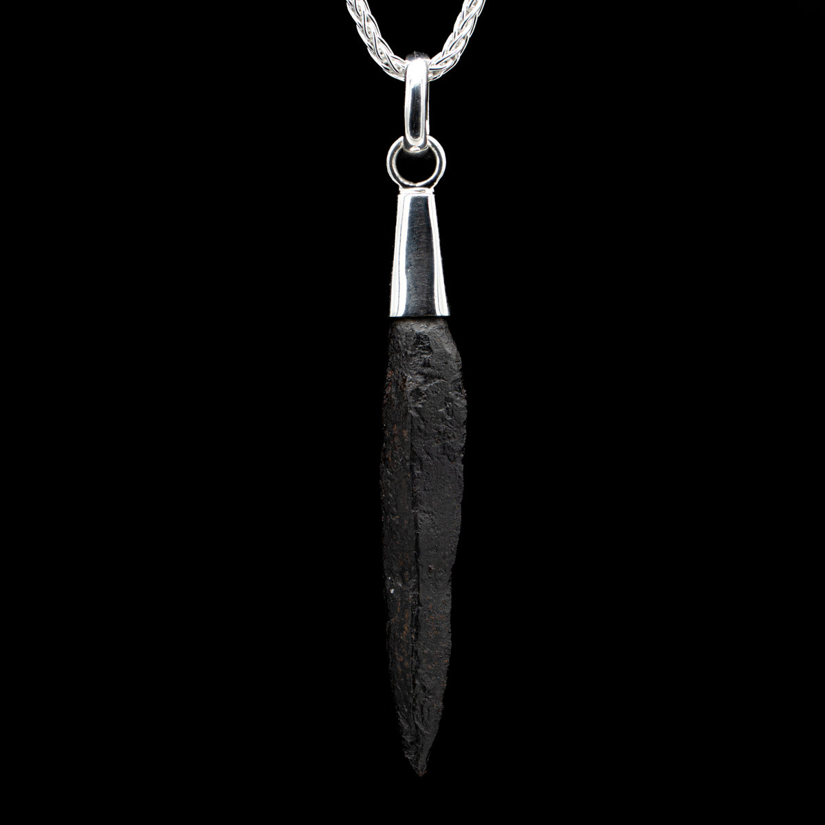 This specimen is a 1.878" Viking arrowhead mounted as a pendant necklace. The arrowhead dates to roughly 900 CE.