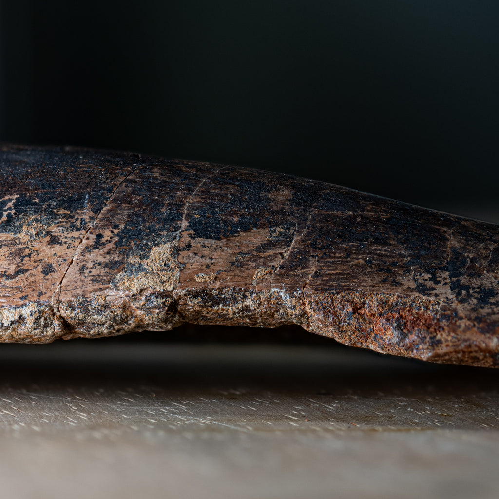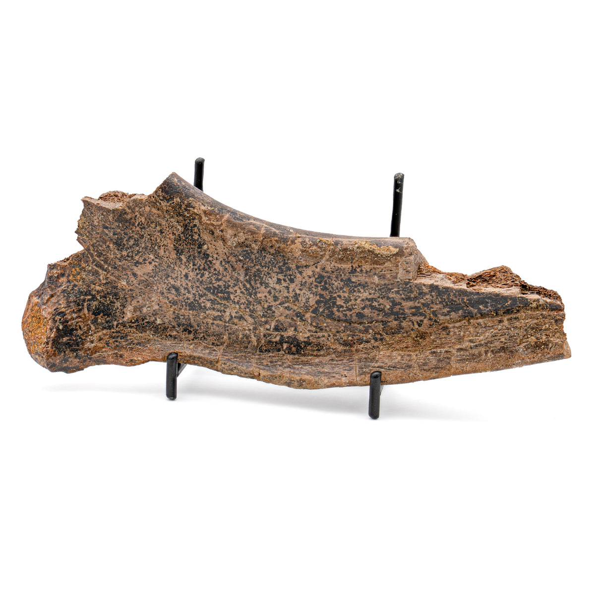 This specimen is a beautiful section of a Hadrosaur fossil bone, measuring 6.684" long. It was recovered on private land in South Dakota's Hell Creek Formation and dates to 66 million years ago. Included with the fossil is a metal display stand.