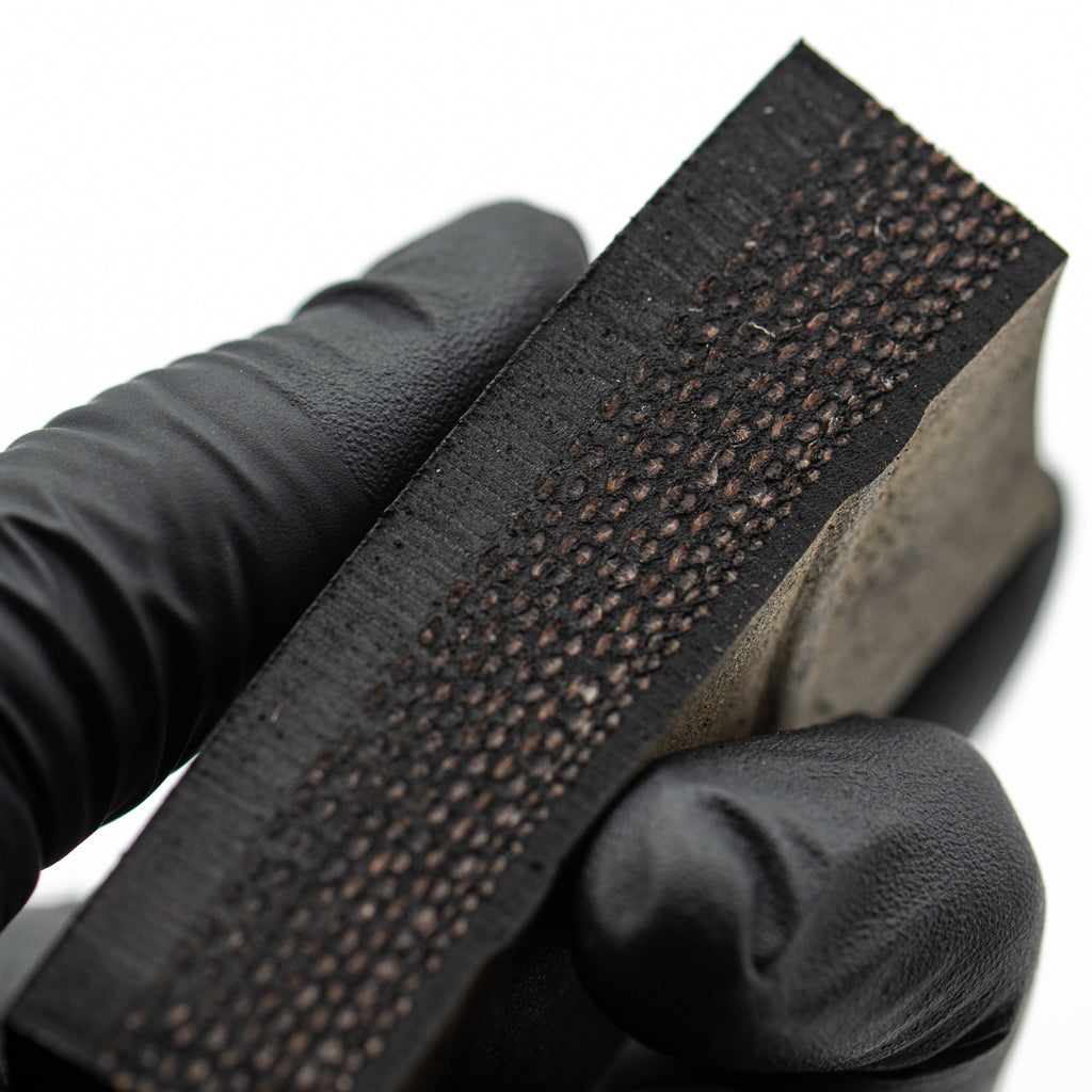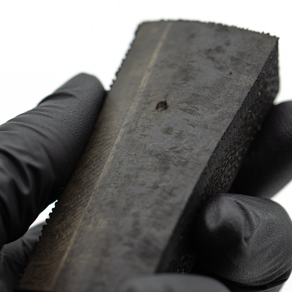 This specimen is a 2.675" mission-flown nose landing gear tire fragment from the Space Shuttle Columbia (OV-102). Serial number verification against public information indicates the tire was removed from service after Columbia's 13th mission (STS-52).