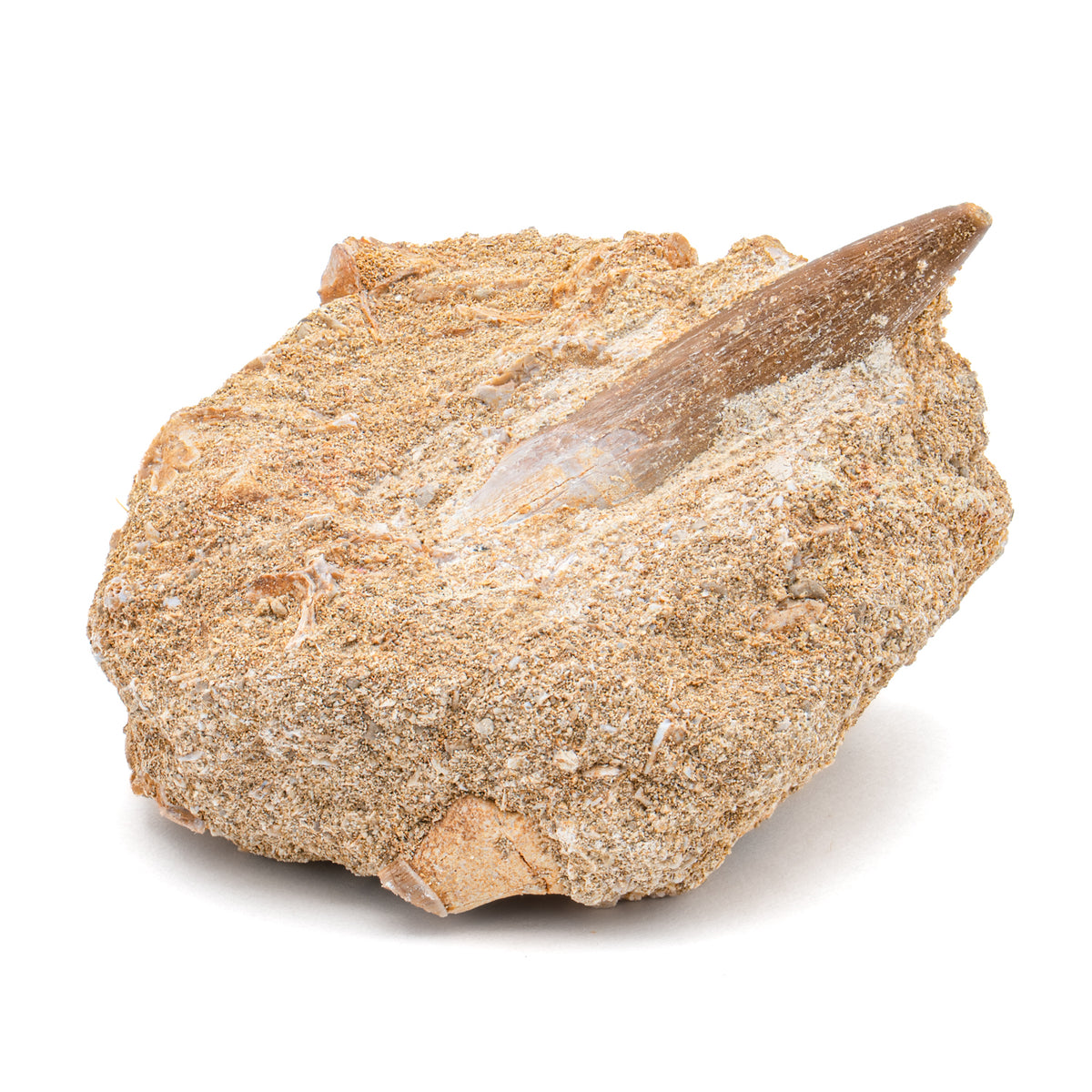 This specimen is a Plesiosaur tooth embedded in matrix. It was recovered from deposits in Morocco and dates to the Late Cretaceous Period.