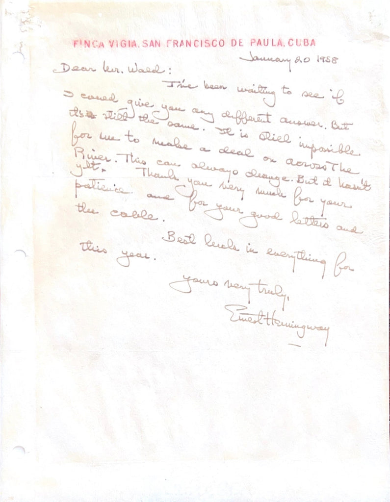 Jedes einzelne Wort wurde einem Brief Hemingways vom Januar 1958 entnommen, der auf seinem geliebten Briefkopf der Finca Vigia geschrieben war. Von seinem Haus mit Blick auf die Innenstadt Havannas aus schrieb Hemingway, dass er trotz des Drängens seines Korrespondenten keine Einigung über seinen Roman „Across the River and into the Trees“ erzielen konnte. Echte Hemingway-Dokumente können oft Tausende von Dollar einbringen.
