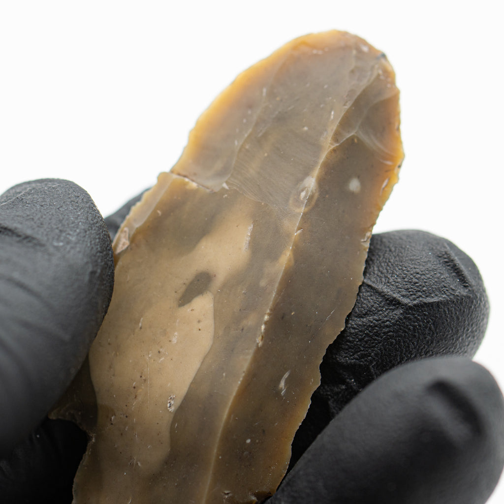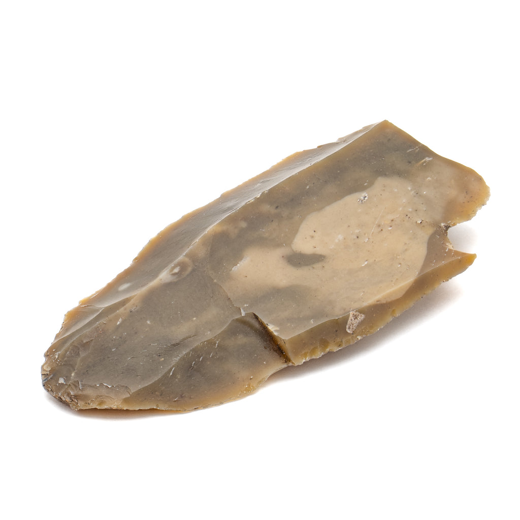 Sie wurden gemeinhin als Faustkeile bezeichnet, doch ihr tatsächlicher Verwendungszweck ging weit darüber hinaus. Es wurden Hackmesser, Klingen, Schaber, Spitzen und Brechwerkzeuge entdeckt, und viele dieser Werkzeuge wurden im Laufe der Zeit möglicherweise für neue Zwecke umgestaltet. Dieses Exemplar ist ein 9 cm langes Steinwerkzeug und stammt von der dänischen Halbinsel Jütland. Es stammt aus der Jungsteinzeit.