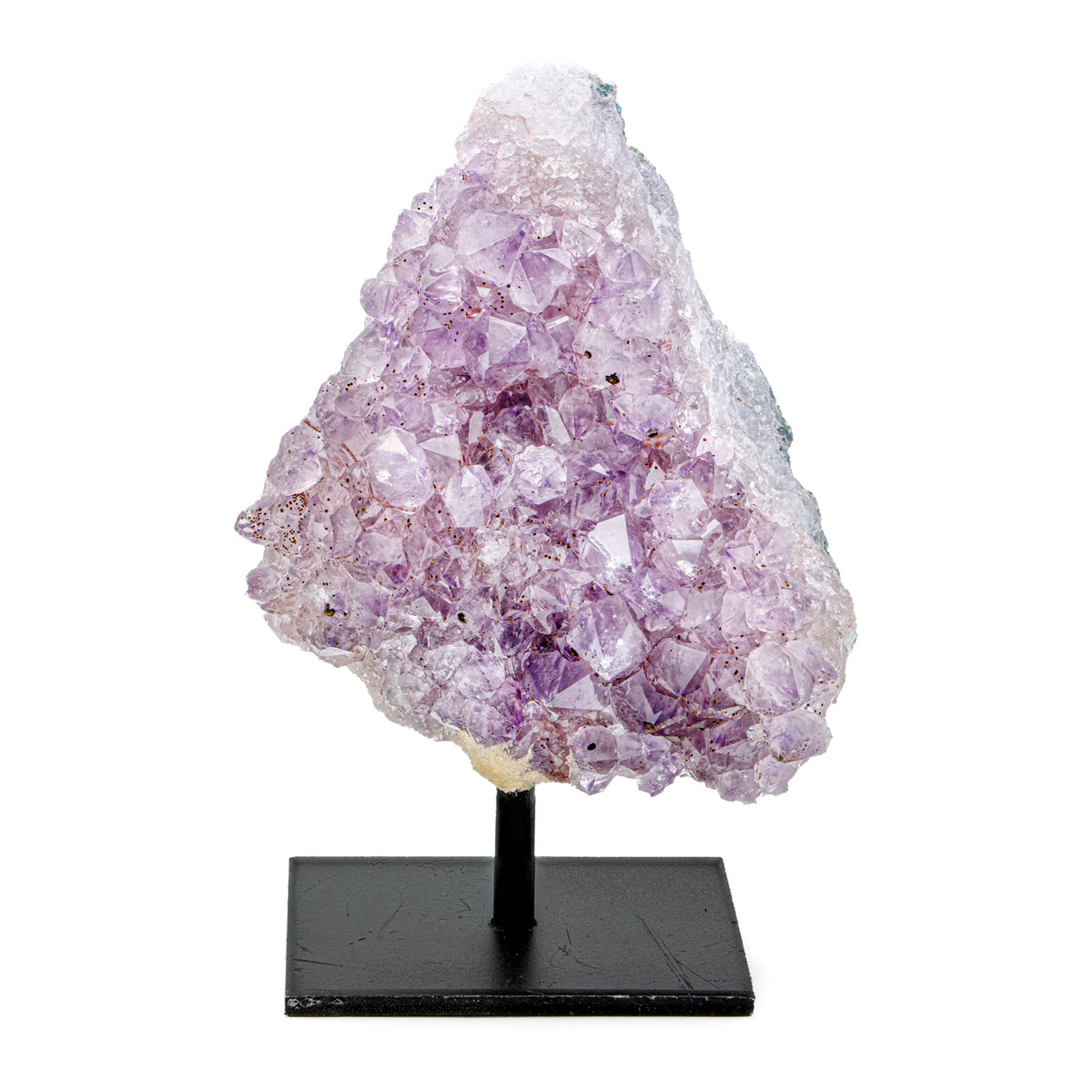 Jeder Amethyst-Cluster wird auf einem klassischen schwarzen Metallständer mit stabilem Sockel geliefert. Jeder Cluster ist eine einzigartige Anordnung von Kristallen einer anderen Geode. Alle Cluster sind wunderschön und einzigartig und weisen eine außergewöhnliche violette Färbung auf.