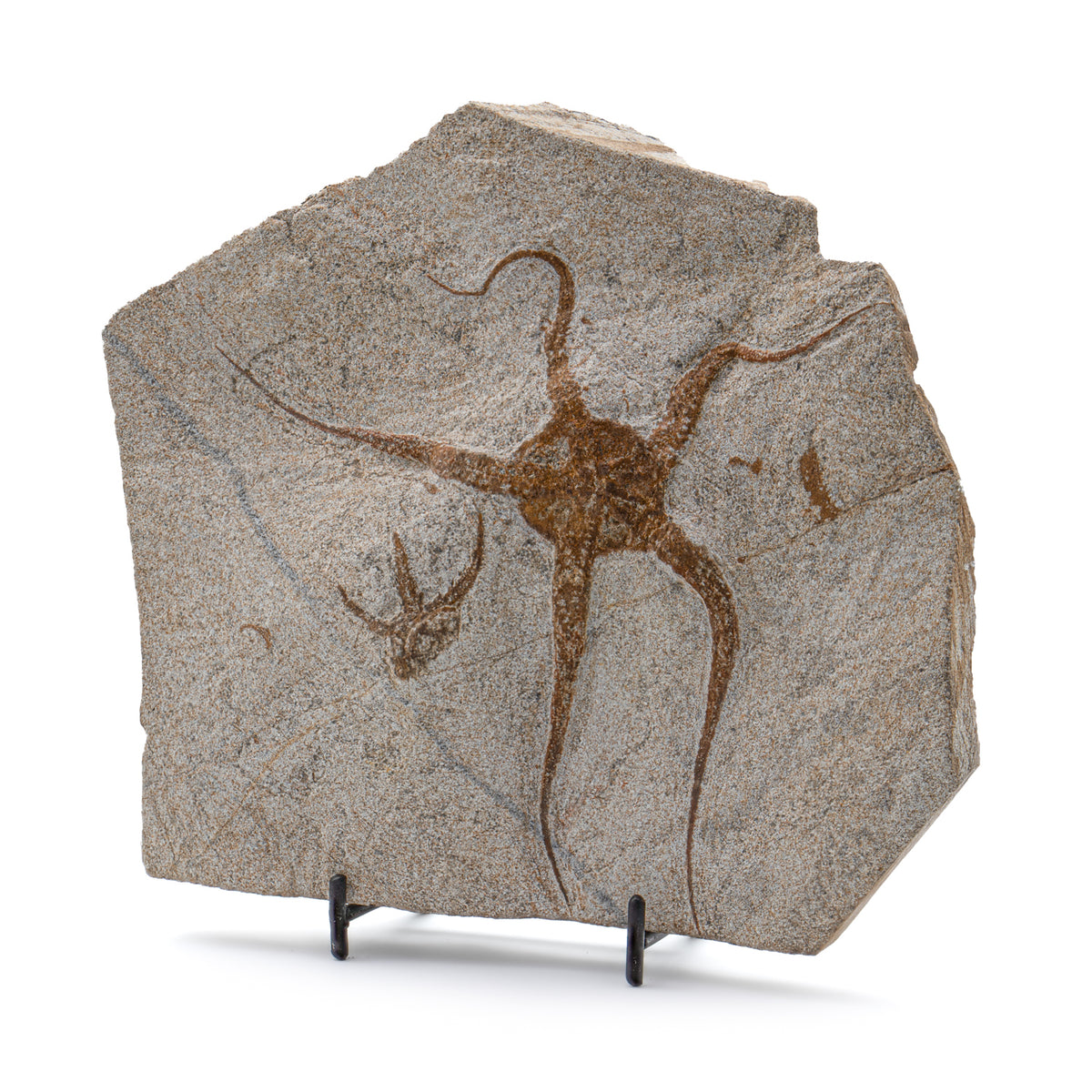 Bei diesem Exemplar handelt es sich um einen einzigartigen fossilen Schlangenstern, der mit einem Ständer zur Präsentation geliefert wird. Eine Informationskarte, die als Echtheitszertifikat dient, ist ebenfalls enthalten.