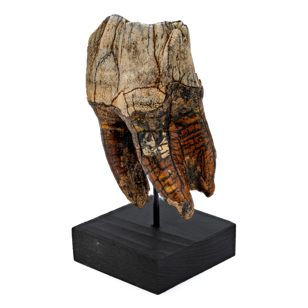 Bei diesem Exemplar handelt es sich um einen 3,60 Zoll langen Wollnashornzahn, der in Sibirien gefunden wurde. Das geschätzte Alter beträgt 20.000 Jahre.