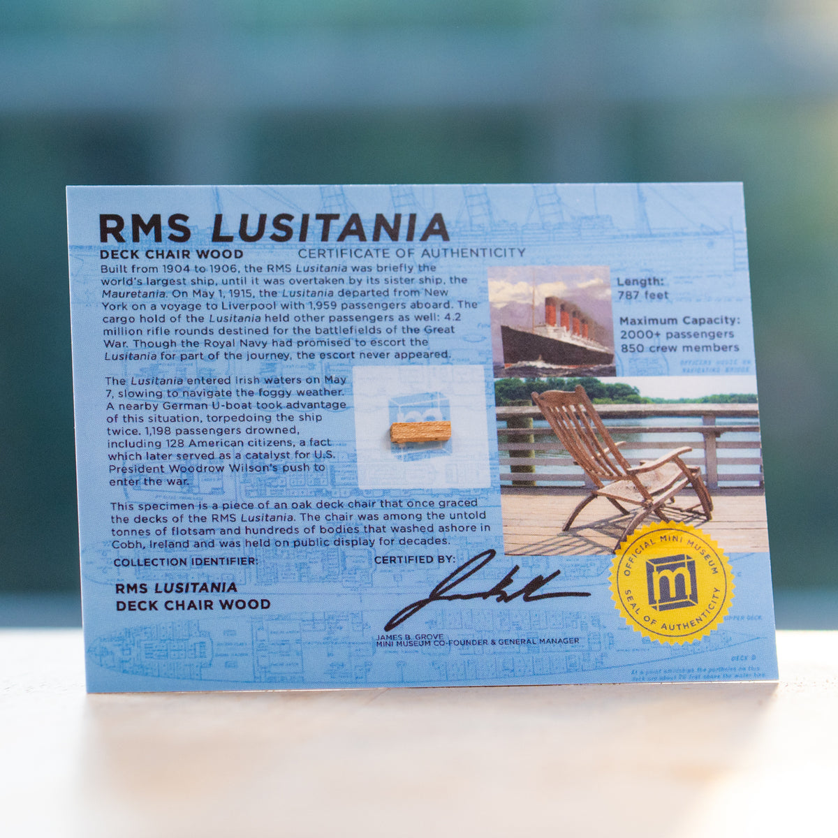 This specimen is a piece of an oak deck chair that once graced the decks of the RMS Lusitania. The chair was among the untold tonnes of flotsam and hundreds of bodies that washed ashore in Cobh, Ireland (known as Queenstown at the time) and was held on public display for decades. It was acquired at auction from Christie’s London office in late 2016. The specimen comes affixed to its informational card with the Mini Museum Seal of Authenticity.