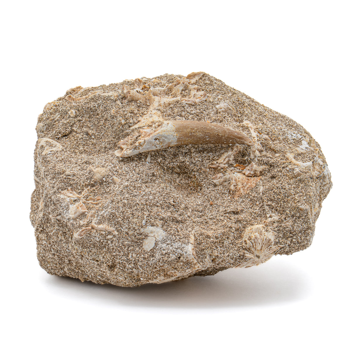 Bei diesem Exemplar handelt es sich um einen in Matrix eingebetteten Plesiosaurierzahn. Er wurde aus Lagerstätten in Marokko geborgen und stammt aus der Oberkreidezeit.