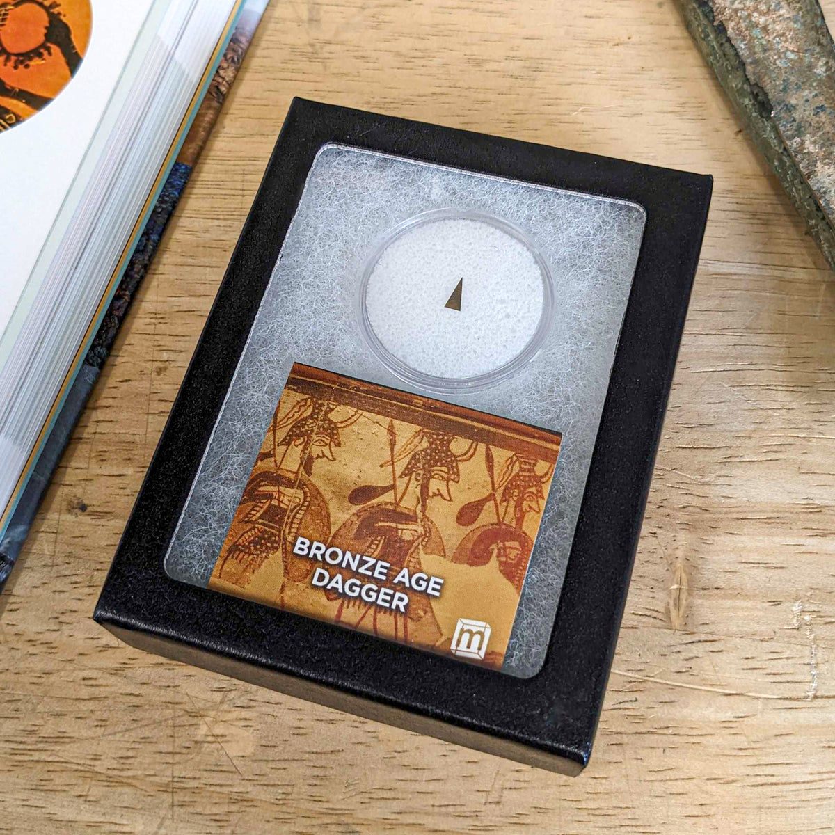 This specimen is a piece of a late 12th-century BCE dagger from the style of the Mycenaean culture. It is a remnant of both the era and its end, hand-rolled and prepared here at Mini Museum.