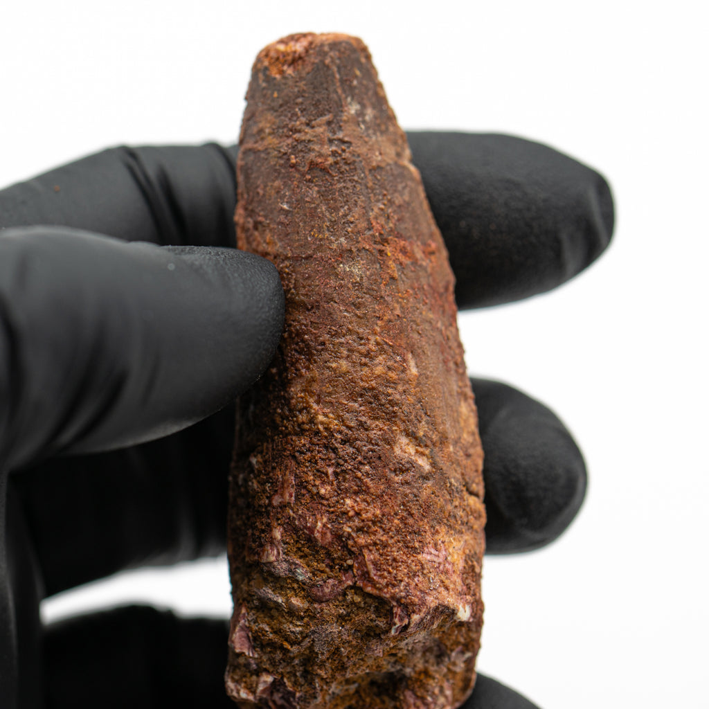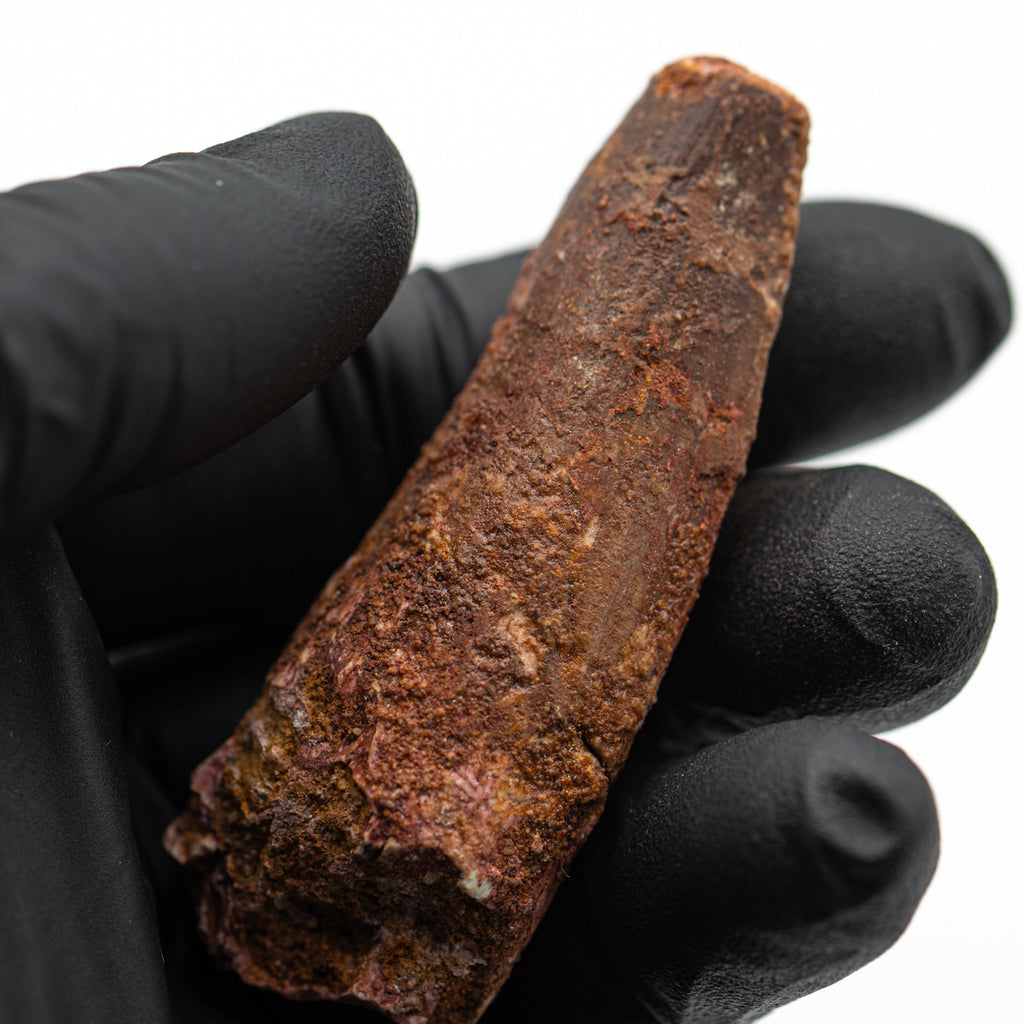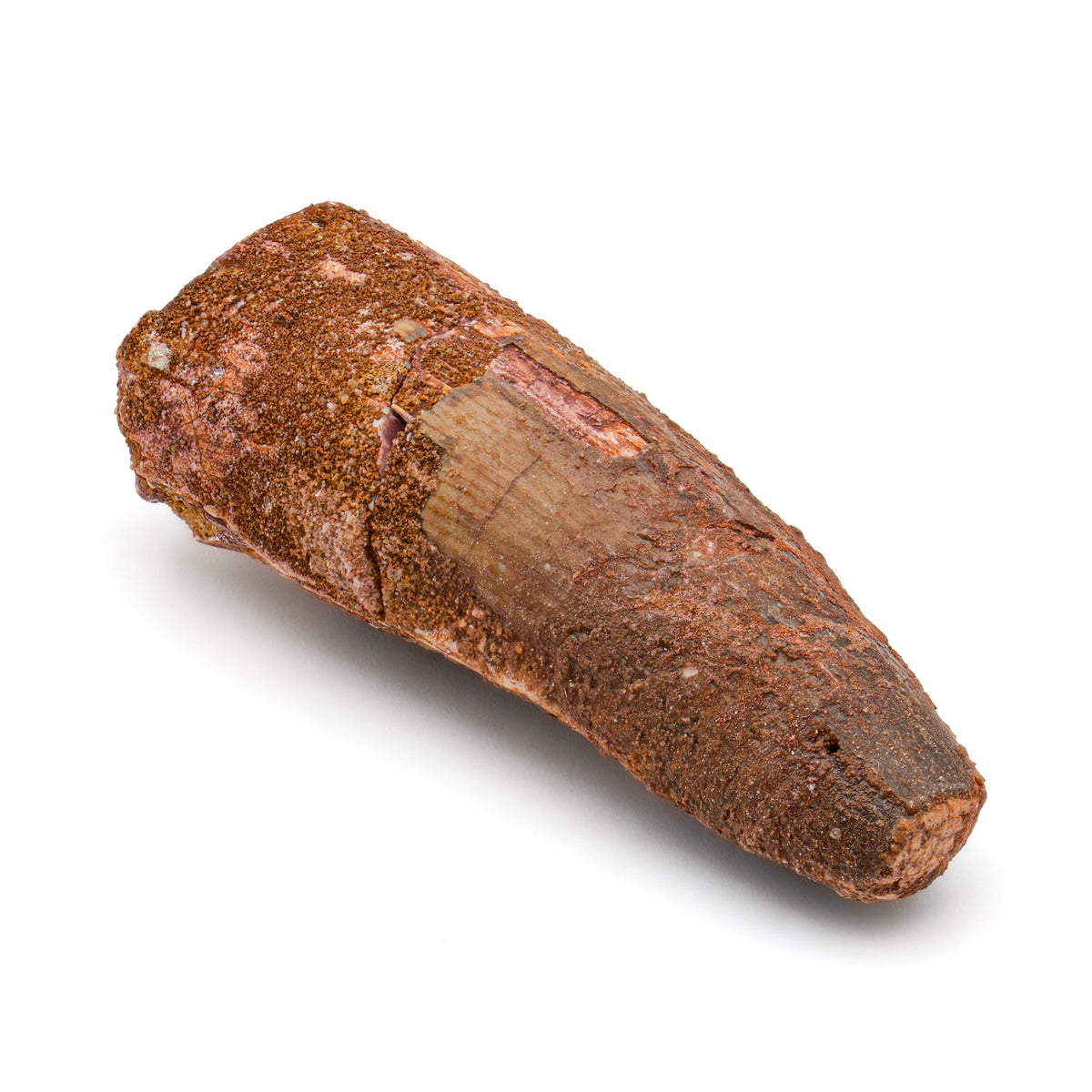 This specimen is a naturally worn crown and partial root of a real, fossilized Spinosaurus tooth from the Kem Kem fossil beds of Morocco. It measures 2.470" in length.