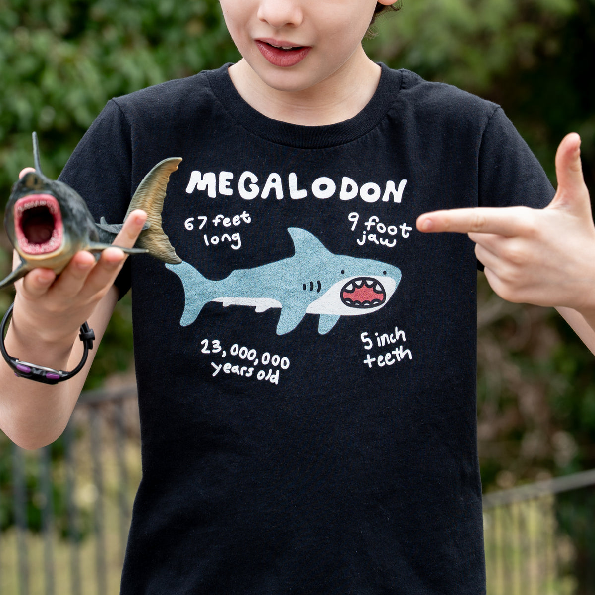 The Megalodon shark dominated the oceans of the world for over 20 million years. Reaching sizes over 60 feet in length, the largest Megalodon jaw reconstruction measures 11ft across and 9ft tall... and now you can see it in adorable cartoon form with this shirt!