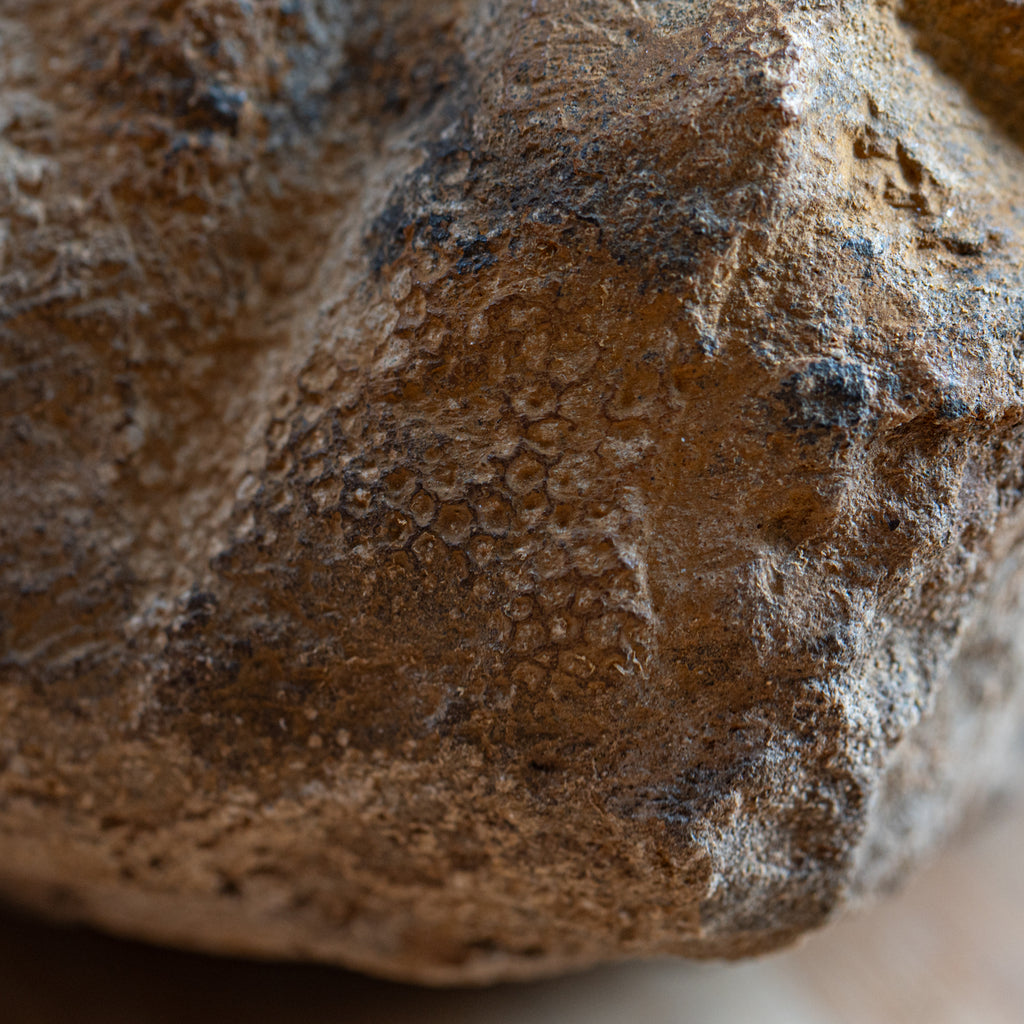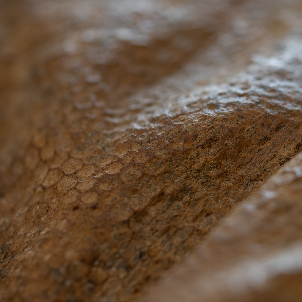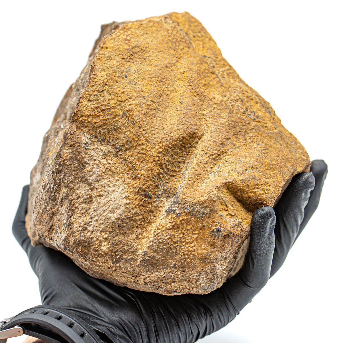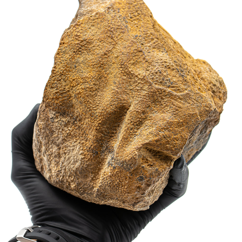 This specimen is a 6.219" fossil which includes a section of Hadrosaur skin on its surface. It was recovered on private land in South Dakota's Hell Creek Formation and dates to 66 million years ago. A certificate of authenticity is included.