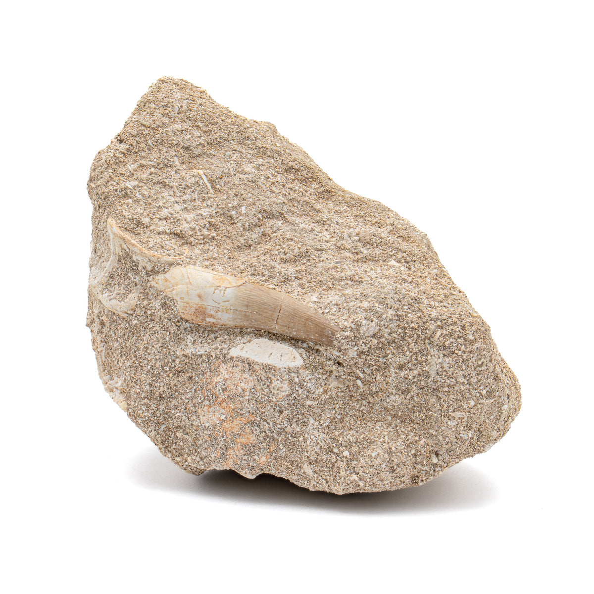 This specimen is a Plesiosaur tooth embedded in matrix. It was recovered from deposits in Morocco and dates to the Late Cretaceous Period.